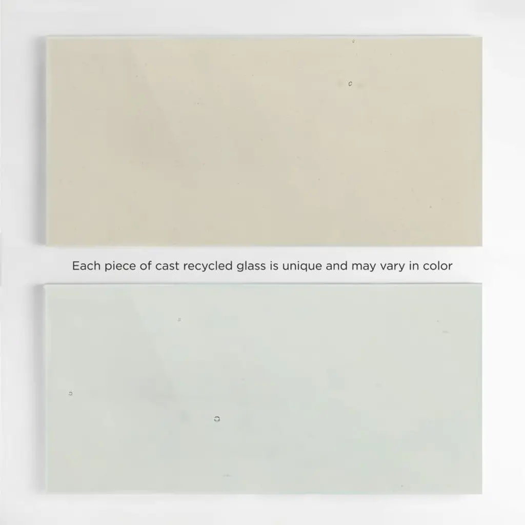 Cast glass nesting side tables by Barcelona-based Mermelada Estudio are simple and elegant in their material mix. Hand-forged for organic texture, tapered iron legs support a thick panel of recycled glass. Gentle ripples and tonal variations in the glass are unique to each table, casting beautiful shadows when illuminated by sunlight. CB2 exclusive.