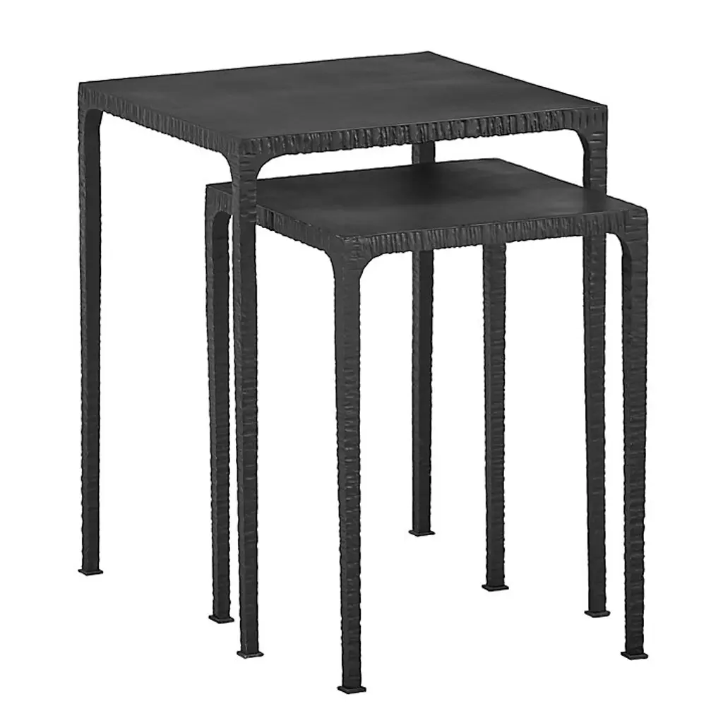 Nesting tables are one of our favorite solutions for small spaces because of their endless versatility. They work as accent tables, end tables, or quick pull-up serving tables when you need them, and tuck away when you don't. Our set of two Natasha Nesting Tables are artisan crafted of solid, quality-weighted iron and hand hammered for a rustic, organic look. Slender legs stand on simple square feet. Natasha Nesting Table features: