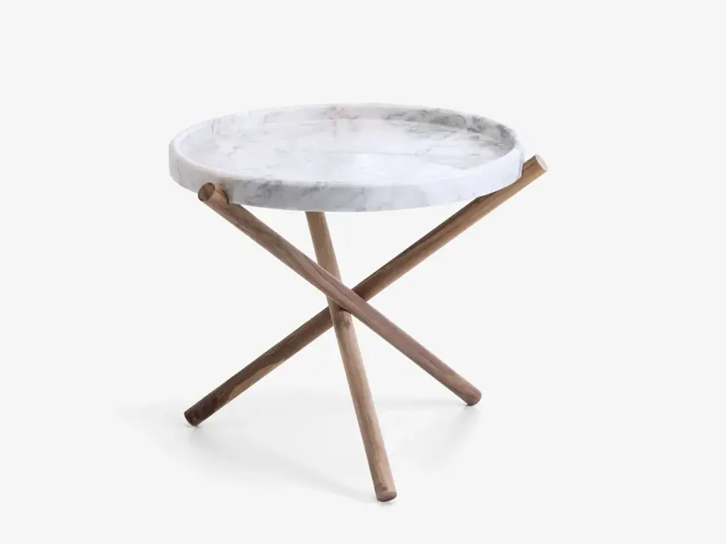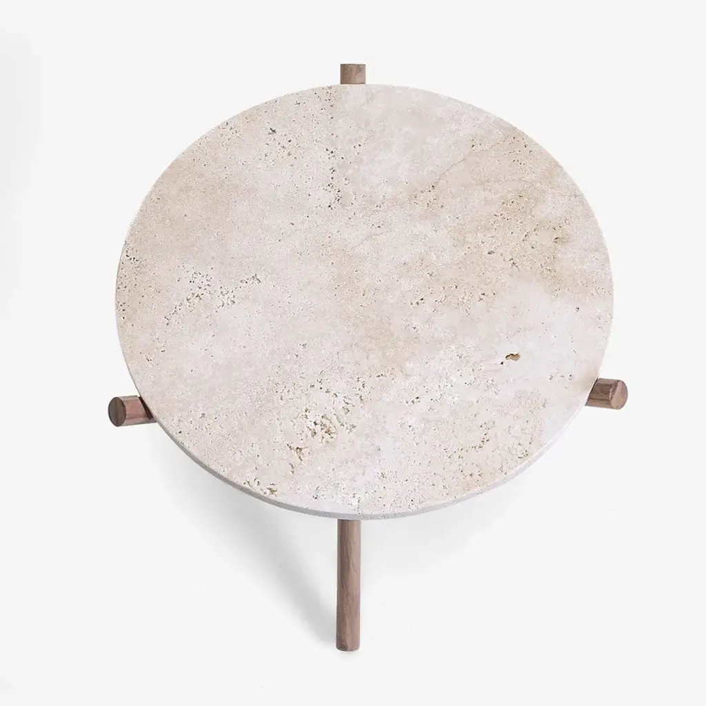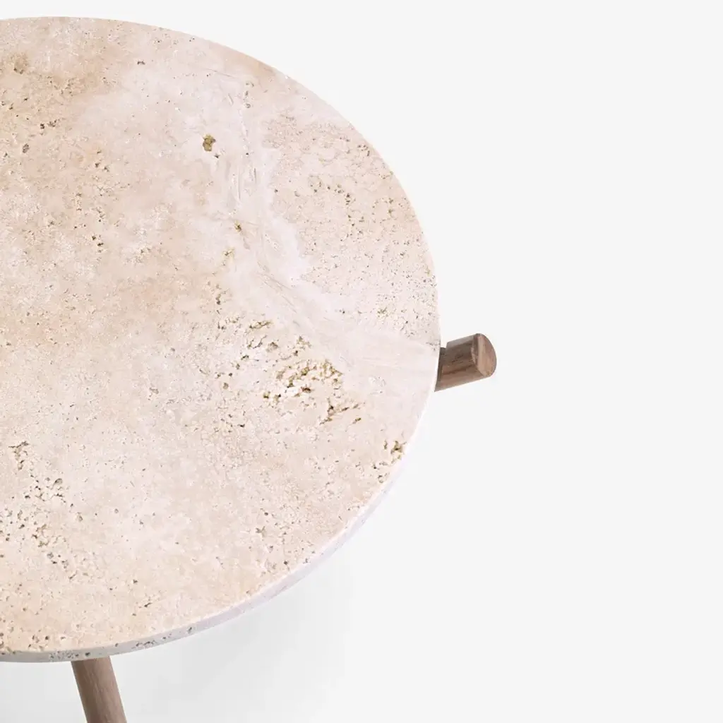 Naturam is a practical and versatile table featuring a circular top in travertine or peperino and a wooden base. The standpoint of its design lays in the intersection of three elements in a minimalist but elegant style, serving as a perfect structure to support classic and timeless trays made of peperino or travertine. Depending on the use of the top, which can be assembled or separated from the supporting base, Naturam is conceived with the dual function of small table and tray, Thanks to the combination of different materials and its essential lines, Naturam is perfect for any environment, fostering a harmonious dialogue between nature and architecture.Tabletop: Circular tabletop Table base: Three DEVA WALNUT CANAL legs, created by the intersection of 3 wooden listels.Stone: Travertine, honed natural limestone with unstuccoed surface. Treated with stain and rain-resistant products. Cutting and welding with state-of-the-art numerically controlled work tools.