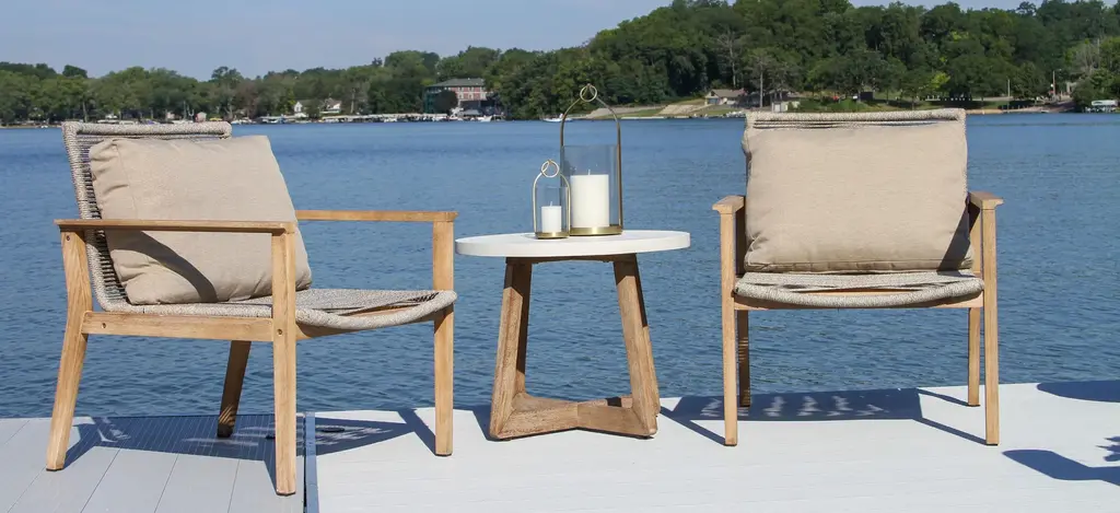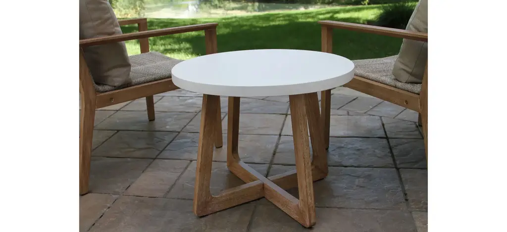 Create a luxury urban look with the 20" round Nautical Accent Table. The top is made from a stain-resistant poly resin concrete blend. The base is stained to resemble teak. This table is the perfect statement piece for your outdoor or indoor space.