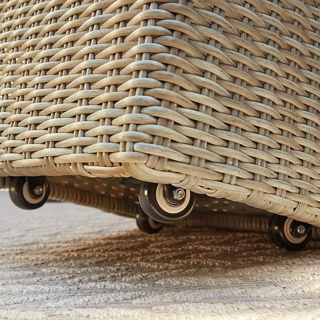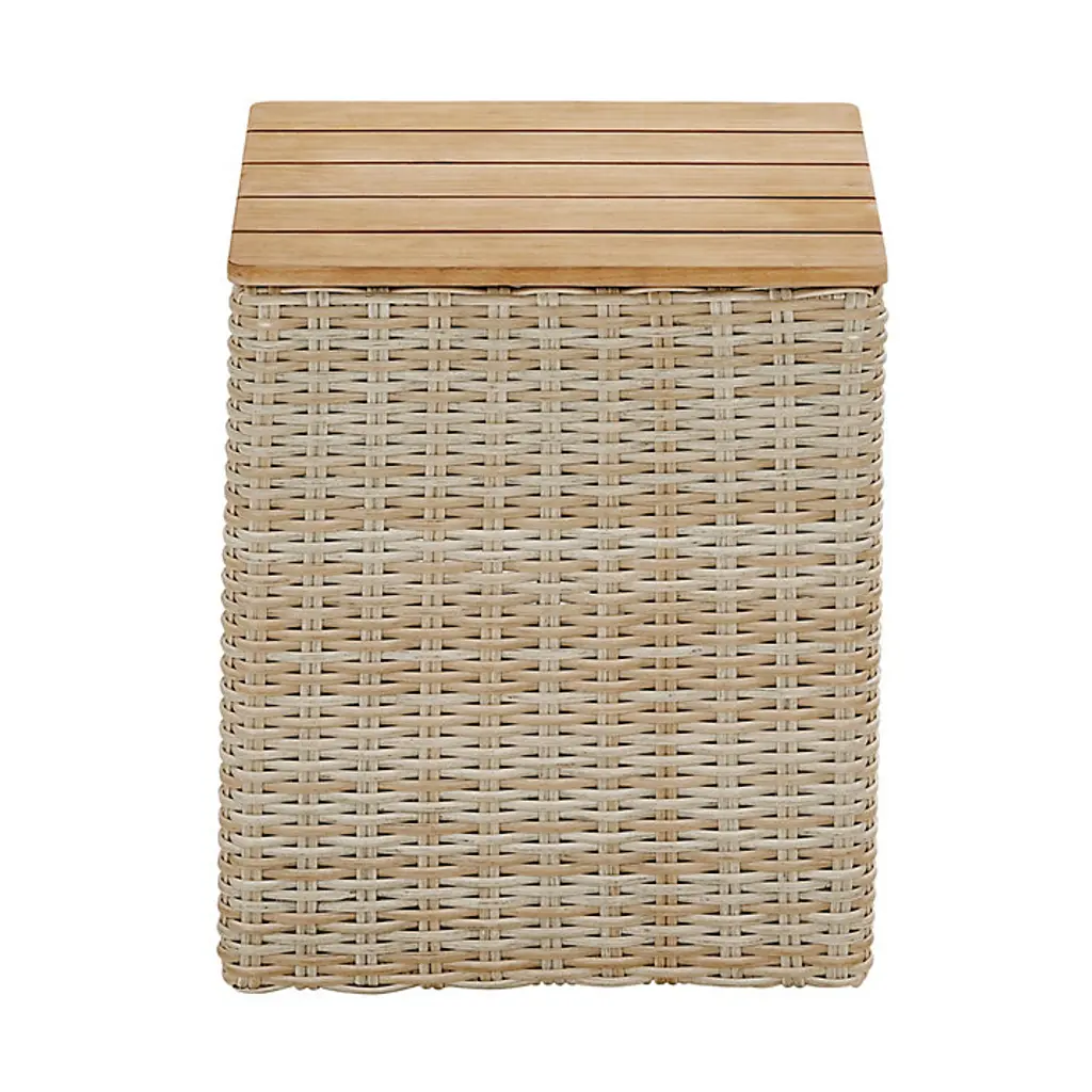Stylish storage, a side table, and extra pull-up seating for your outdoor entertaining spaces. Our Navio Castered Storage cube is hand woven of resilient all-weather wicker over a strong, rust-proof aluminum frame. The slatted top is made of naturally weather-resistant premium teak and allows rain to drain through. Top lifts off, so you can fill the inside with pool toys and extra entertaining supplies. Left untreated, the natural teak finish will mellow to a warm, silvery gray over time. Hidden casters make this versatile storage piece easy to move wherever the party goes. We recommend using an outdoor furniture cover to extend the life of your piece. Navio Castered Storage Cube features: