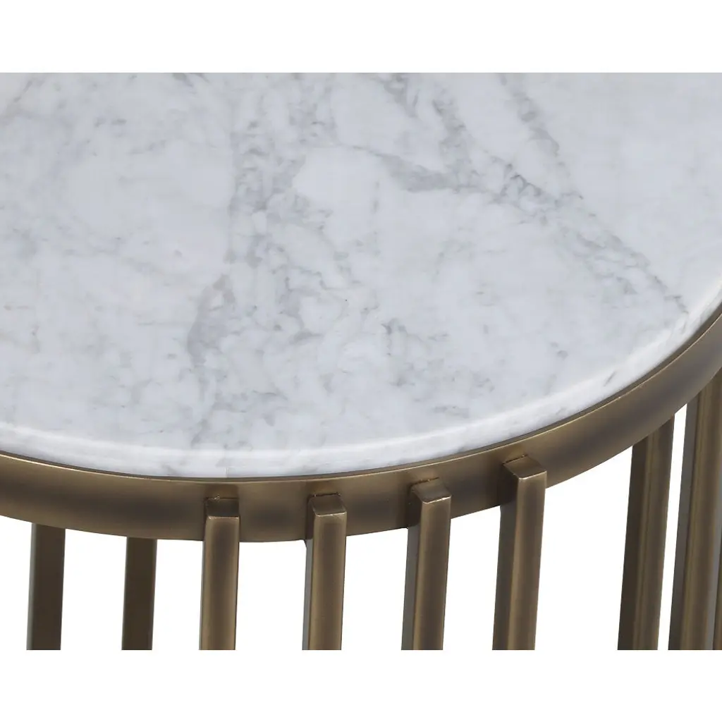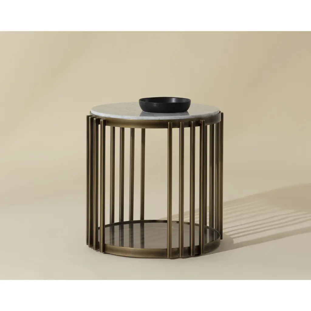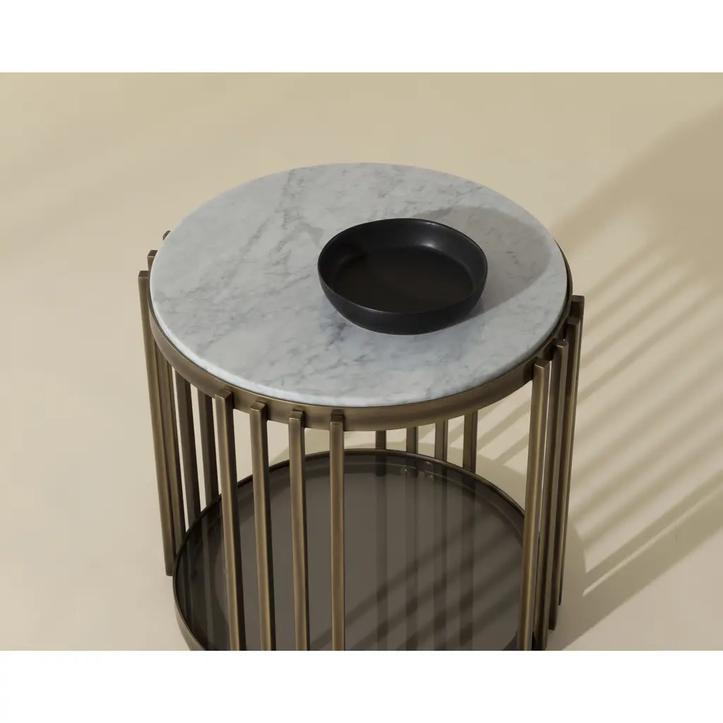 Introduce an element of grandeur to any space with this marvelous end table. Features a 21mm solid Carrara white marble top with a 6mm smoked tempered glass bottom. Completed with a stylish powder-coated metal frame in a rustic bronze finish. Coordinating coffee and console tables also available. As marble is a natural material, unique veining, pitting, fissures, micro-cracks and colour variations are all characteristics that add to the uniqueness and beauty of each piece.