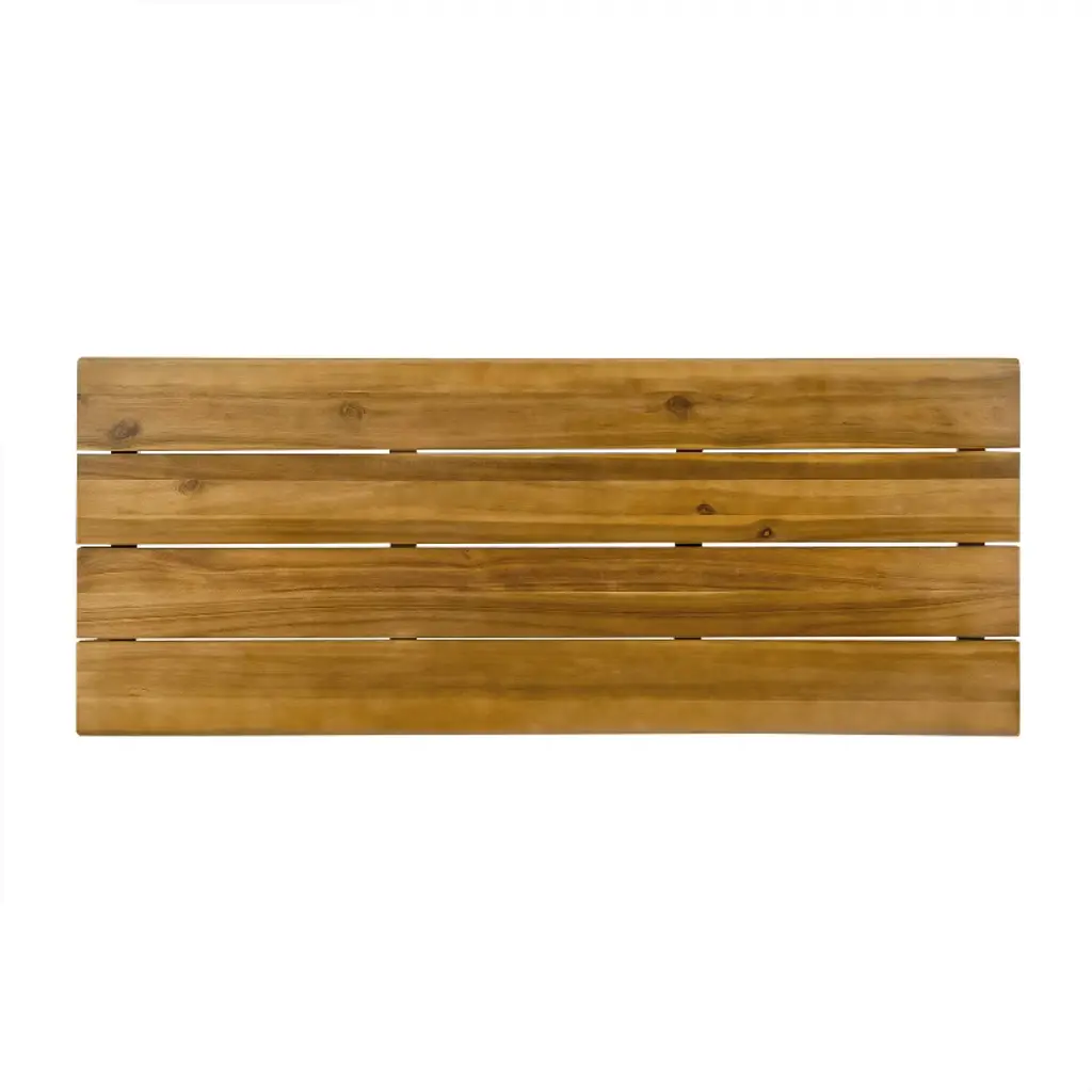 NAYSAYE Patio End Tables presents an Industrial Wood and Metal Bar Table that blends modern industrial style with rustic charm. The solid acacia wood top features a natural teak finish, showcasing an exotic wood grain. Flared iron hairpin legs with a powder-coated black finish add sturdy support while enhancing the table's stylish design. With rounded edges for safety and comfort, this versatile outdoor piece is perfect for both casual and elegant gatherings on your patio or porch.