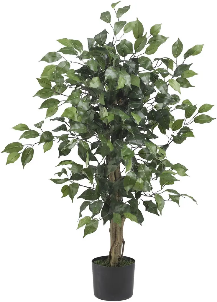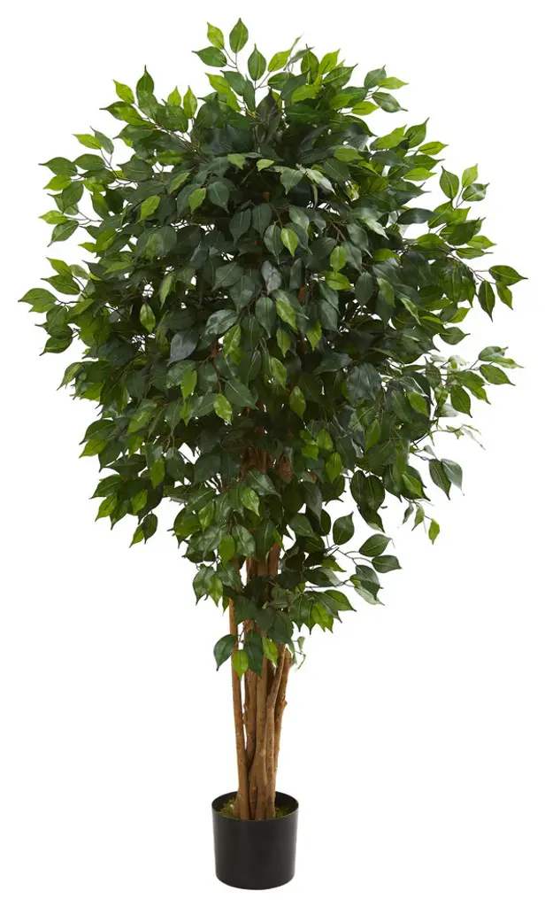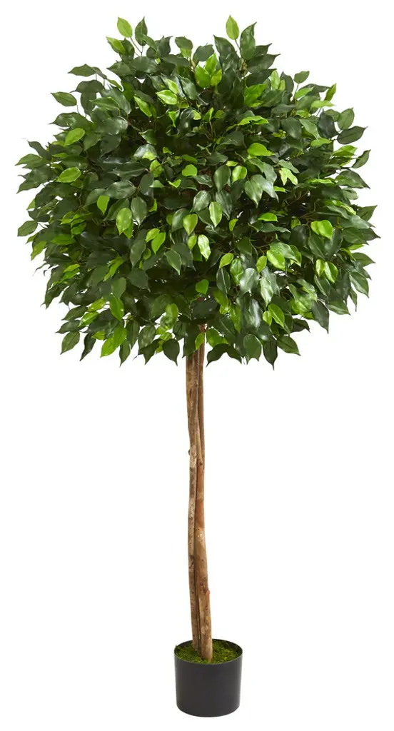 This artificial ficus tree has a more rounded topiary look, giving it a classic appeal that is sure to fit with any decor. With natural slim trunks and a full, lush display of leaves, this 6.5-foot artificial ficus tree would be perfect placed next to an end table or adding color to a dining room.