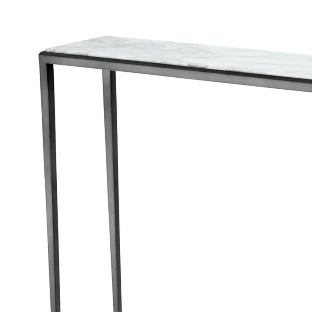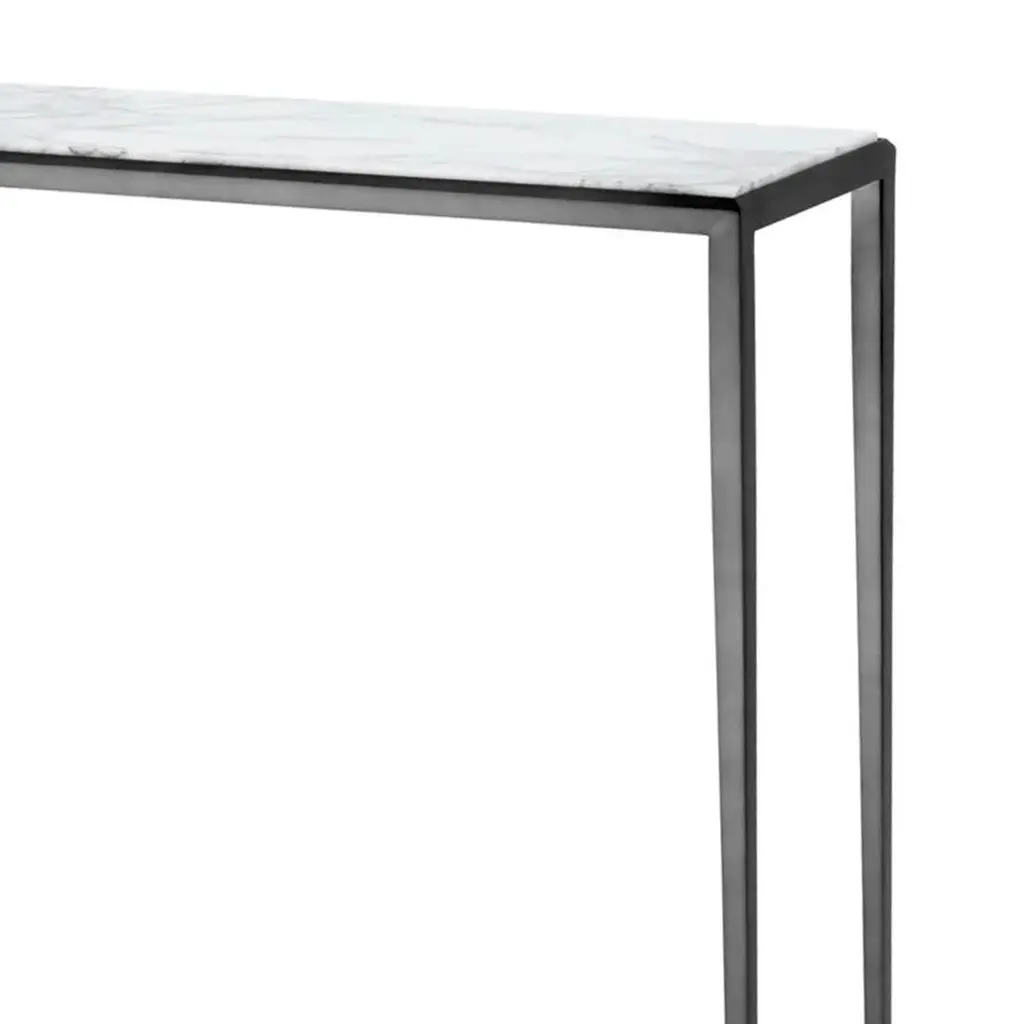 Console Table Bronze Needle with structure insteel in bronze finish and with white marble top.Marble's veins change depending on the block of marble from which the top is cut. Each top is a little different but the quality of the marble.Also available on request in Needle Gold Console Table.