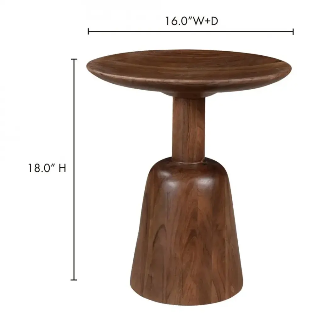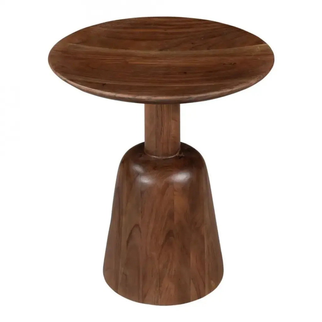 Sculpted serenity. Built from solid acacia wood, the Nels end table puts the materials front and center, serving as a natural showcase for the woodgrain. Its tastefully sculpted form features a broad base and a simple round tabletop, a pedestal for beautiful happenings. For a perfectly simple take on contemporary design, look to Nels.