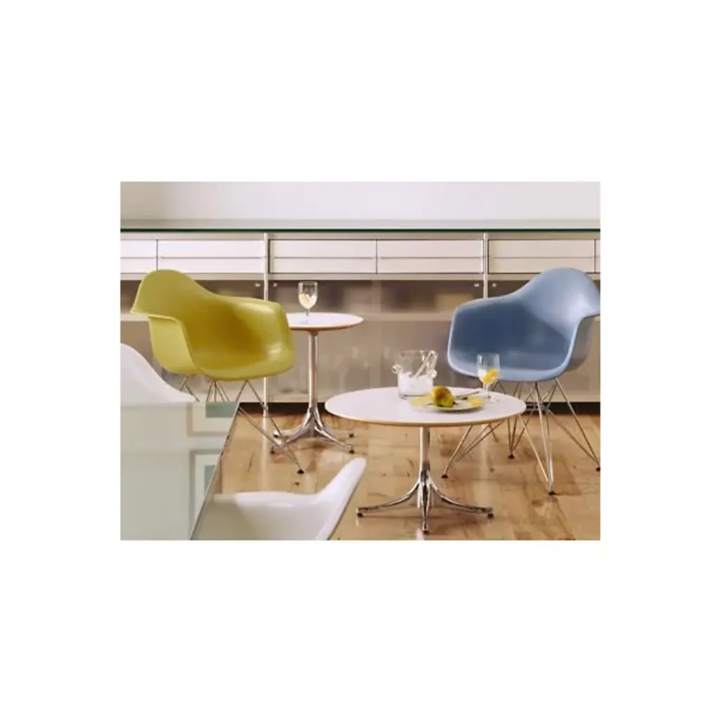 Add a stylish accent to your indoor living spaces with the Nelson End Table from Herman Miller. Emblematic of the clean lines and human-focused balance sought by designer George Nelson, this 1954 design starts with a four-legged metal base that swoops upward to a single column, perfectly securing a bevel-edged laminate top large enough for in a variety of finishes. The end table is simple enough to blend in with a variety of décor styles while still being eye-catching enough to remind you where you set down your tea, phone, or book atop it.