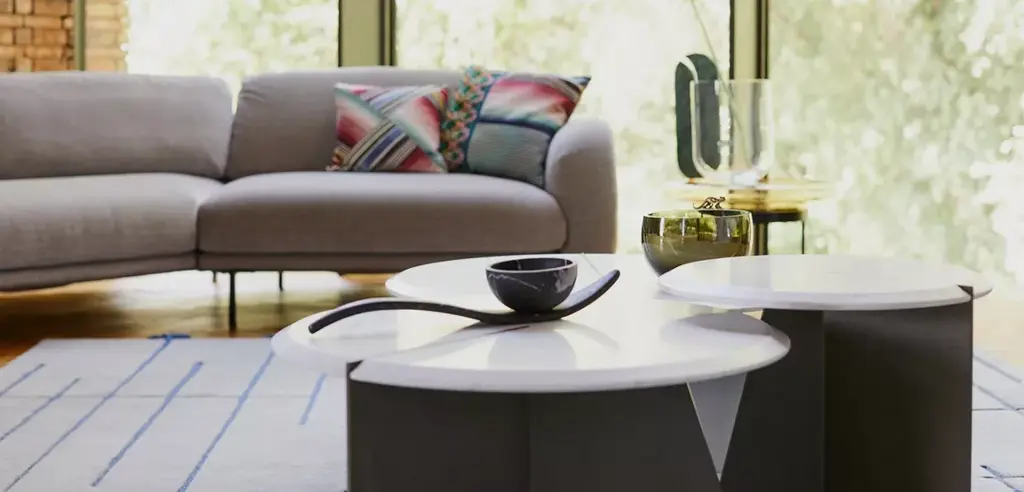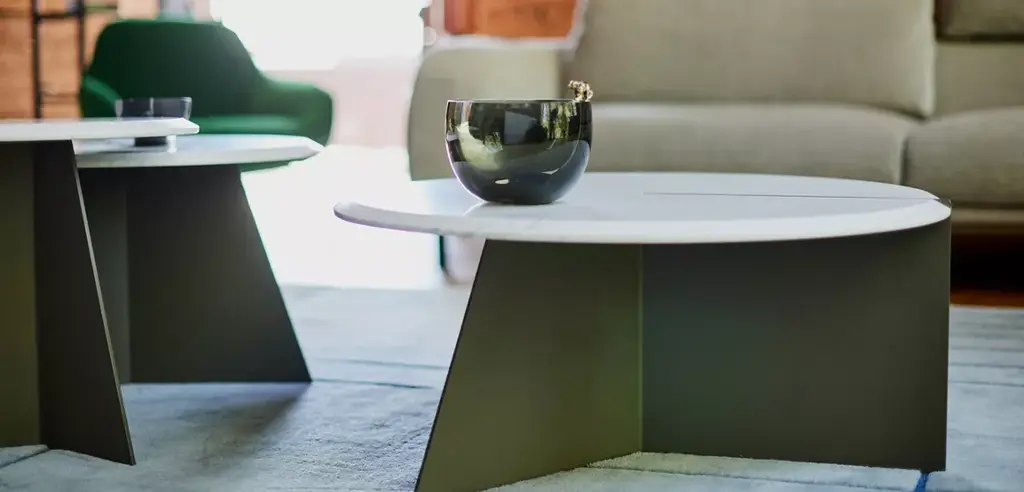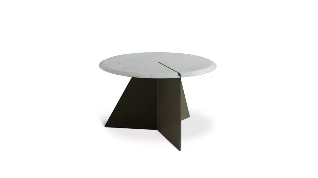 Simple and round, the three dimensional design of the Nenuphar collection creates a micro-landscape in front of your sofa. One of the three elements of the tripod base is flush with the surface of the marble top, highlighting the beveled edge.