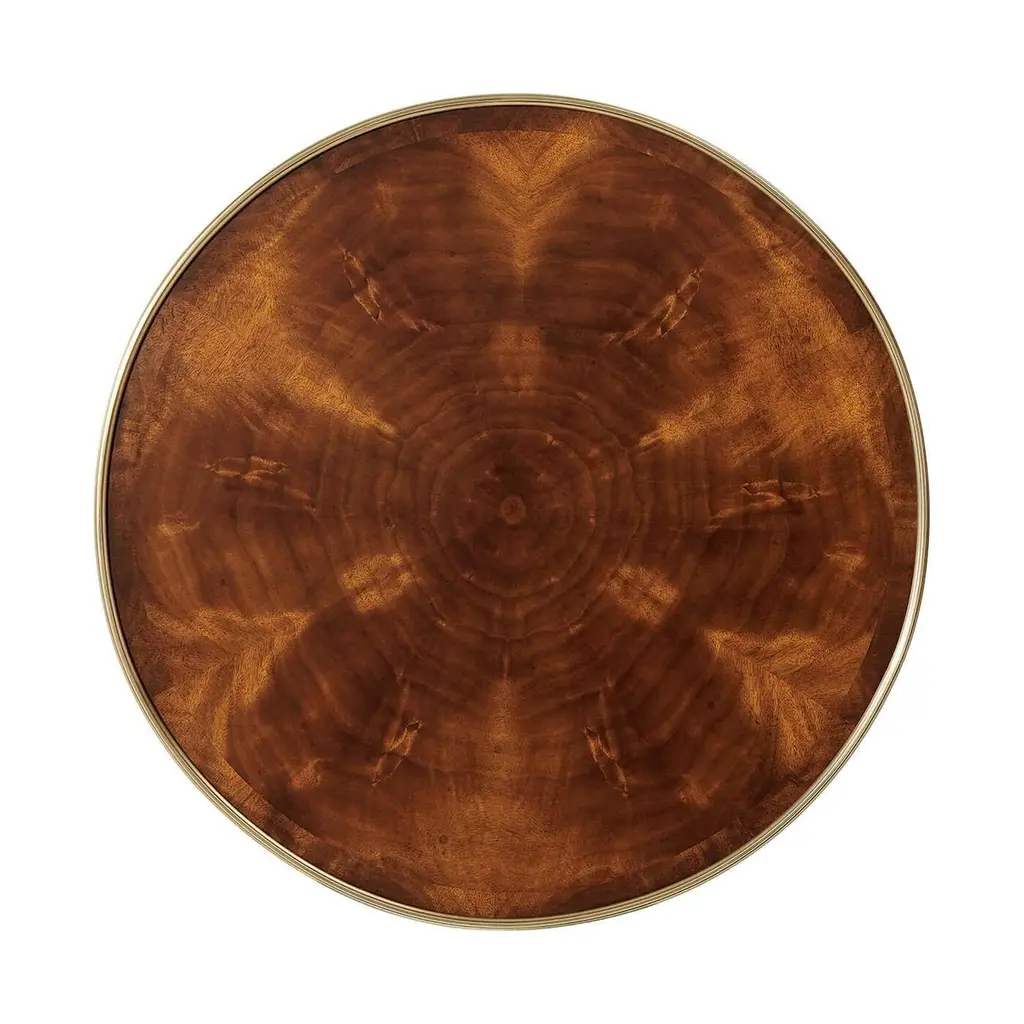 Crafted from rich mahogany and accented with brass-bound details. The circular top is gracefully complemented by a single frieze drawer, ideal for keeping small essentials close at hand. Elegant inswept splay legs taper to brass sabots, joined by a matching brass-bound undertier for added functionality and sophistication.Perfect as a side table or accent piece, this design reflects the elegance of 19th-century European neoclassicism while seamlessly fitting into today’s traditional or transitional interiors. Its proportions and classical detailing bring a sense of grandeur to any setting.Dimensions: 20" W x 20" D x 28" H