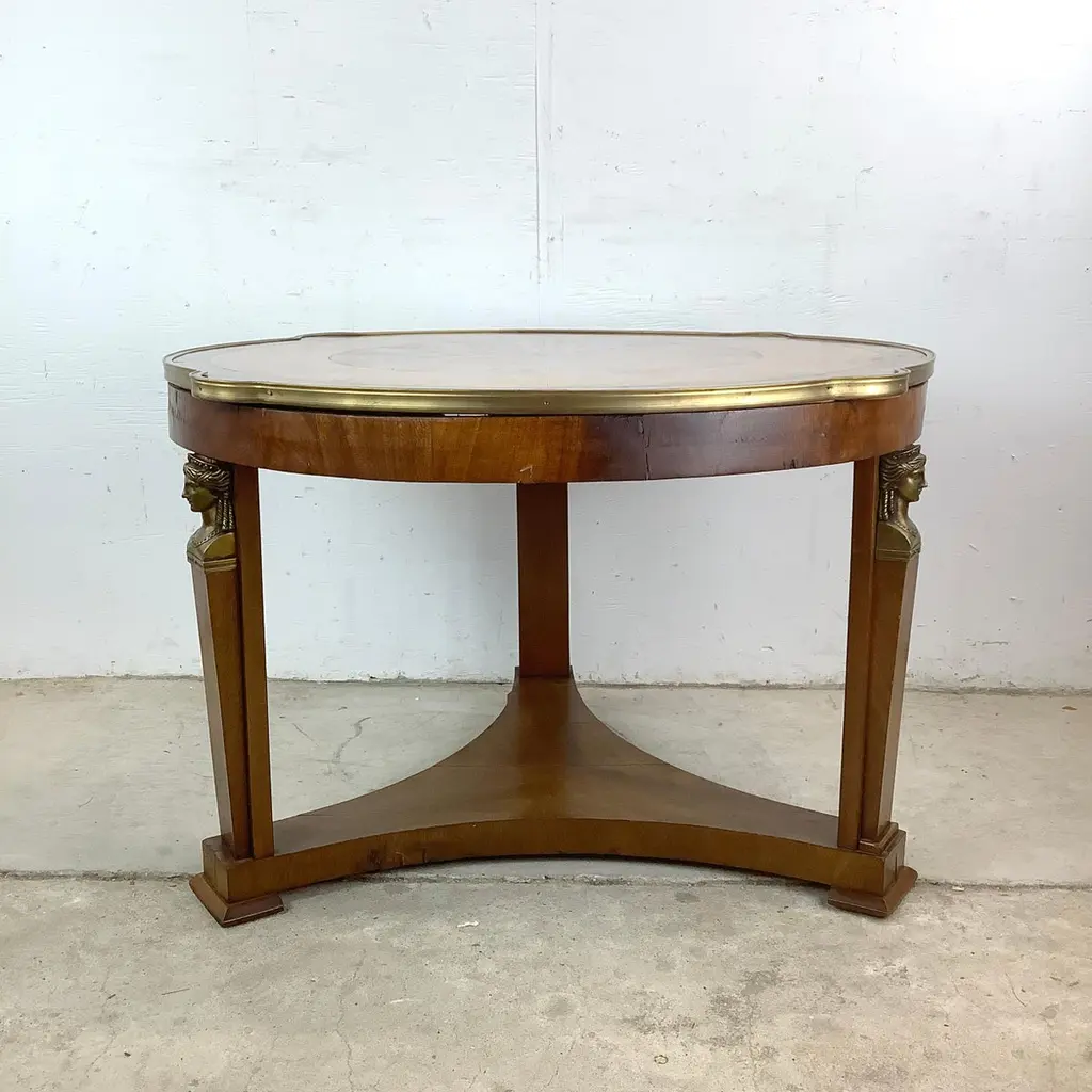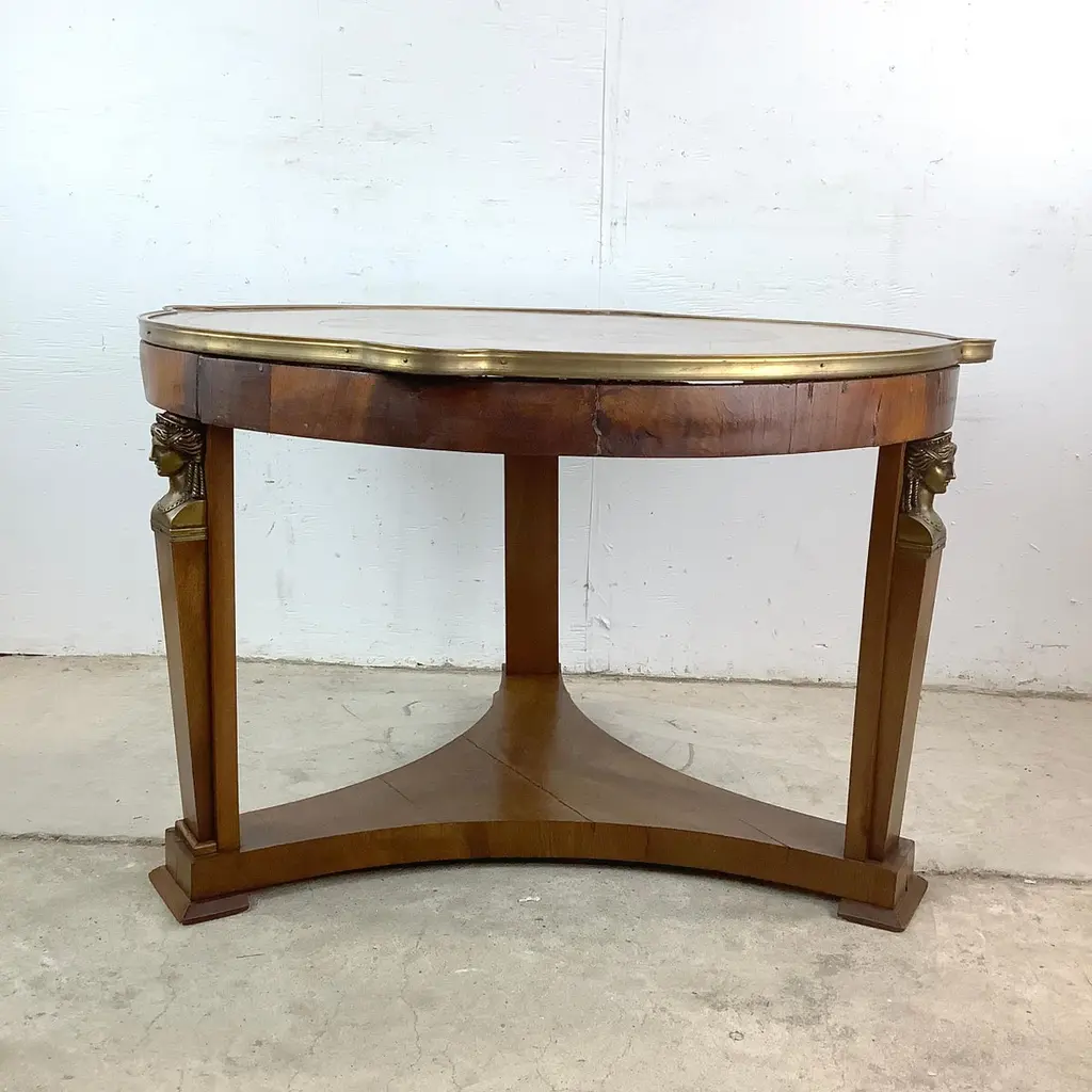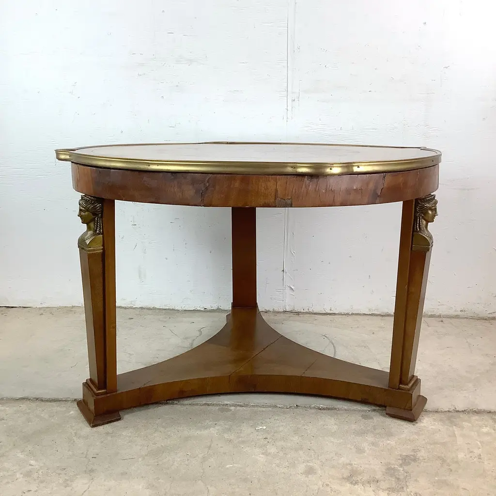Evoking the stately charm of 19th-century Europe, this Biedermeier gueridon table captures the essence of Neoclassical and Empire design. Its circular top is poised over a single pedestal base, culminating in three sturdy feet for perfect balance. A handsome vintage wood finish unites all elements in a rich and cohesive presentation.Ormolu trim brings in a refined golden detail that subtly elevates the entire design. These brass accents are a hallmark of Empire and Biedermeier furnishings, offering a tasteful nod to antique European decor. The result is a table that feels both grounded and elegant.True to Biedermeier principles, this piece embraces clean lines and a streamlined form. It offers an understated grandeur that works well in settings where form and function meet. Its strength lies in the clarity of its structure and the quality of its materials.Sized to fit comfortably in a wide range of spaces, this gueridon table is as practical as it is stylish. It works wonderfully in entryways, between armchairs, or as a decorative accent table under a mirror or painting.The aged wood tone has a soft, inviting luster that only comes from decades of careful wear. Its finish enhances the tactile richness of the piece, making it visually warm and pleasing to the touch.For admirers of antique European furniture, this table embodies the quiet luxury and enduring relevance of Biedermeier design. It’s a piece that reflects thoughtful craftsmanship and timeless aesthetic ideals.Whether styled with antique books or a modern ceramic vase, this gueridon table adapts gracefully, showcasing a rare mix of historical lineage and everyday beauty.Dimensions: 37w 37d 23hCondition: age appropriate wear, vintage finish worn, scuffs/scratches, edge wear, discoloration, see photos.