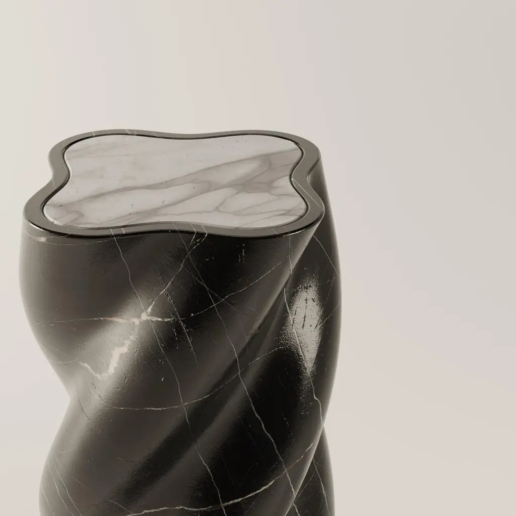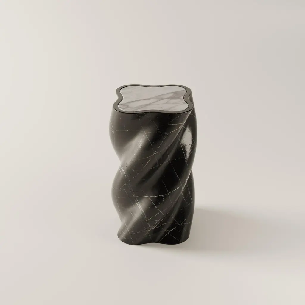 Clean lines, simple geometry and strong materiality are the main features of BURGIO's U line. The fUUUUsillo accent table takes cheeky inspiration from Southern Italy's beloved fusilli pasta shape. Handcrafted from three stunning European marble types, the base is carved from a single block so the veining flows seamlessly over and around its pasta-inspired curved edges. tAAAble is currently available in the following three colour options:Arabescato + Nero Marquina: exquisite and highly sought after Italian stone, characterized by its beautiful white background and distinctive grey veining + black marble topNero Marquina + Arabescato : pitch black bituminous limestone with white veining, extracted from the region of Markina, Basque Country in the North of Spain + white marble topRojo Alicante + Nero Marquina: a warm, rich, earthy red marble with striking white and gray veins, quarried in Spain + black marble topItalian design tradition with a modern twist; aesthetic & functional. Founded by Isabella Burgio and Alireza Sadeh in January 2022, BURGIO sits at the intersection between design & functionality: colour, texture and form. Isabella and Alireza's practice is all about integrating playfulness into the creative process as well as the final product, caring deeply about the whole process, from design to production and actively sourcing the best partners to bring their concepts to life.