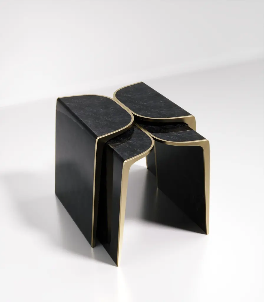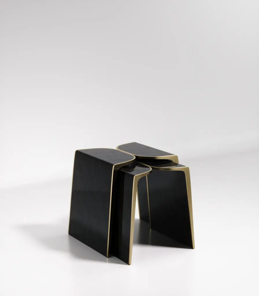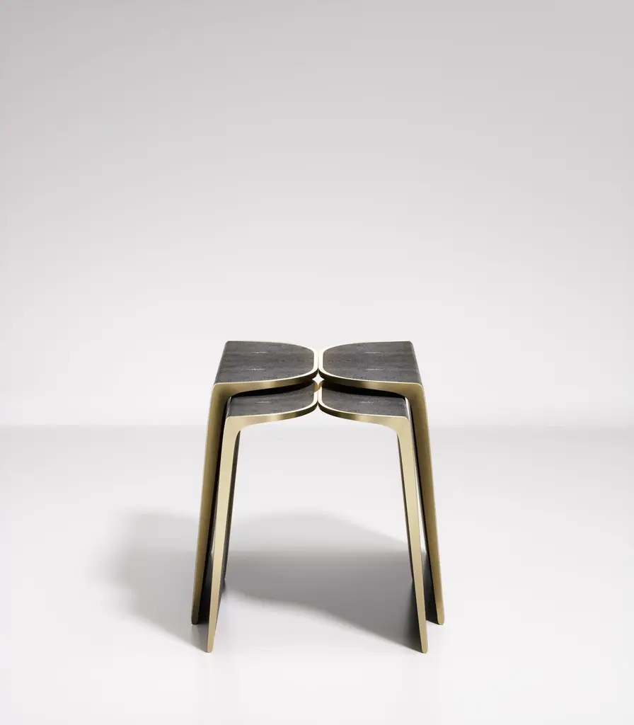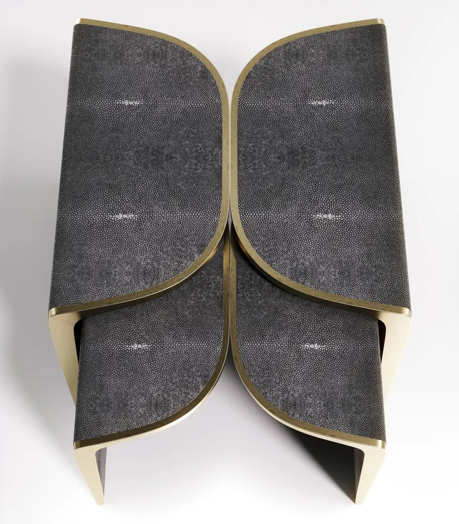The kiss nesting side tables by Kifu Paris are both elegant and organic in their unique design. The coal black shagreen inlaid piece curves inwards to create the "kiss" effect. The borders are accentuated by bronze-patina brass. These pieces are designed by Kifu Augousti the daughter of Ria and Yiouri Augousti. Available in other finishes and to purchase separately. Part of the Kiss Capsule, see images of the collection at end of the slide.The finish of the shagreen is authentic as it is hand-dyed and the designer calls the finish look: "coal black shagreen."The dimensions of this piece are Medium- Depth 54cm / top Width 40cm / bottom Width 54 cm / Height 53 cmLarge- Depth 54cm / top Width 50cm / bottom Width 60 cm / Height 56 cmAll Kifu Paris pieces are handmade by artisans, ultimately making each piece unique.Custom color/sizing available on request.Wipe clean with soft dry cloth.Although inspired by her parents, her collection of Home Accessories and Furniture is a distinct identity of its own. Kifu uses handmade techniques of elaborate inlay patterns of shagreen, shells, semi-precious stones, materials she experienced as a child growing up in her parent’s studio, but interpreted in a younger quirkier way reflecting her youth. From her "jewelry inspired knobs" on decorative boxes, gold bar boxes and an extravagant inlay pattern mix of shagreen and shell inspired by galactic constellations, as seen on her enormous round mirror, is refreshing to see. Kifu embodies whimsical elements throughout her collection and is not afraid to be daring and unexpected in her approach to design.All shagreen-covered items should be kept out of direct sunlight, color variants may occur on the stingray and other exotic finishes, but this showcases the Parisian label's commitment to creating authentic luxurious products using natural components.