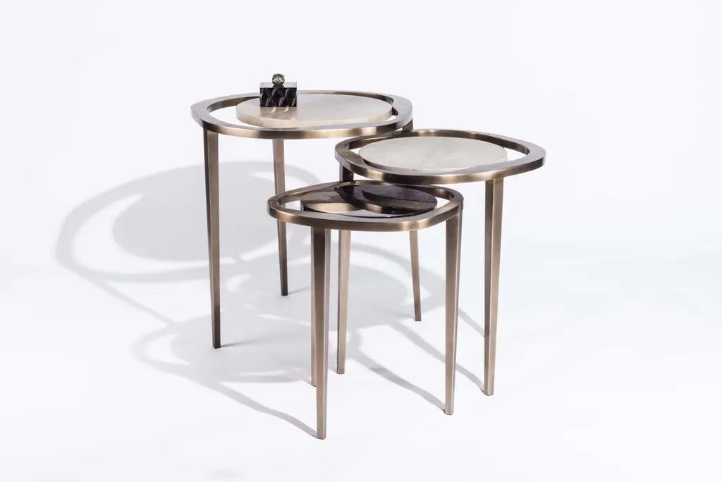 The Paris based label has distinguished themselves since their launch, with their iconic use of shagreen mixed with brass and other exotic materials. All furniture is handcrafted by skilled artisans, ultimately making each piece unique, designed in Paris and produced in the Philippines.The nesting lily side table in small is part of a series of nesting side tables. Nesting tables available for purchase separately only. The beautiful organic shaped top in black pen shell is supported by linear elegant bronze-patina brass legs. The shell pieces are individually selected before they are inlaid creating beautiful tonalities on the finished piece. Two other sizes available, images at end of slide. Custom color/sizing available on request. The dimensions of this piece are 44 x 42 x 50 cm / 17.25" x 16.5" x 19.75"All R&Y Augousti pieces are handmade by artisans, ultimately making each piece unique. Wipe clean with soft dry cloth.Acclaimed design duo Ria & Yiouri Augousti have established themselves since the 1990s as pioneers of modern-vintage style through their luxurious Art Deco inspired collections.The Paris based label has distinguished themselves since their launch, with their iconic use of shagreen mixed with brass and other exotic materials. All furniture is handcrafted by skilled artisans, ultimately making each piece unique. All shagreen-covered items should be kept out of direct sunlight, color variants may occur on the stingray and other exotic finishes, but this showcases the Parisian label's commitment to creating authentic luxurious products using natural components.
