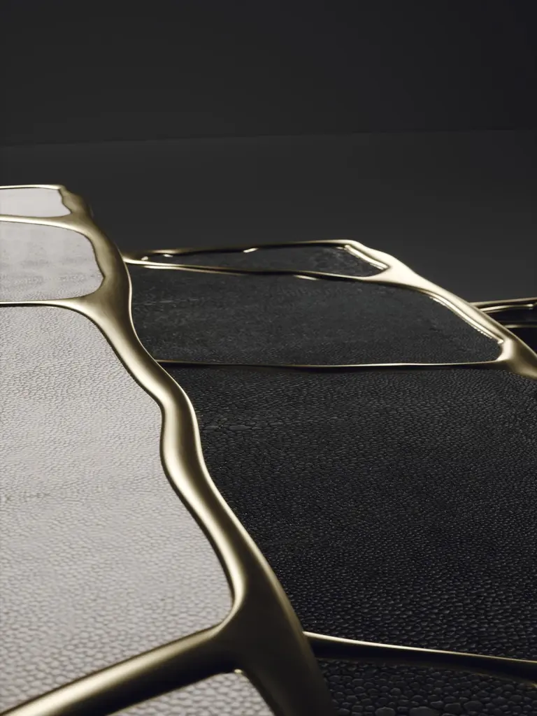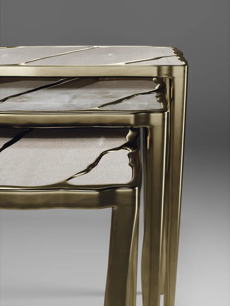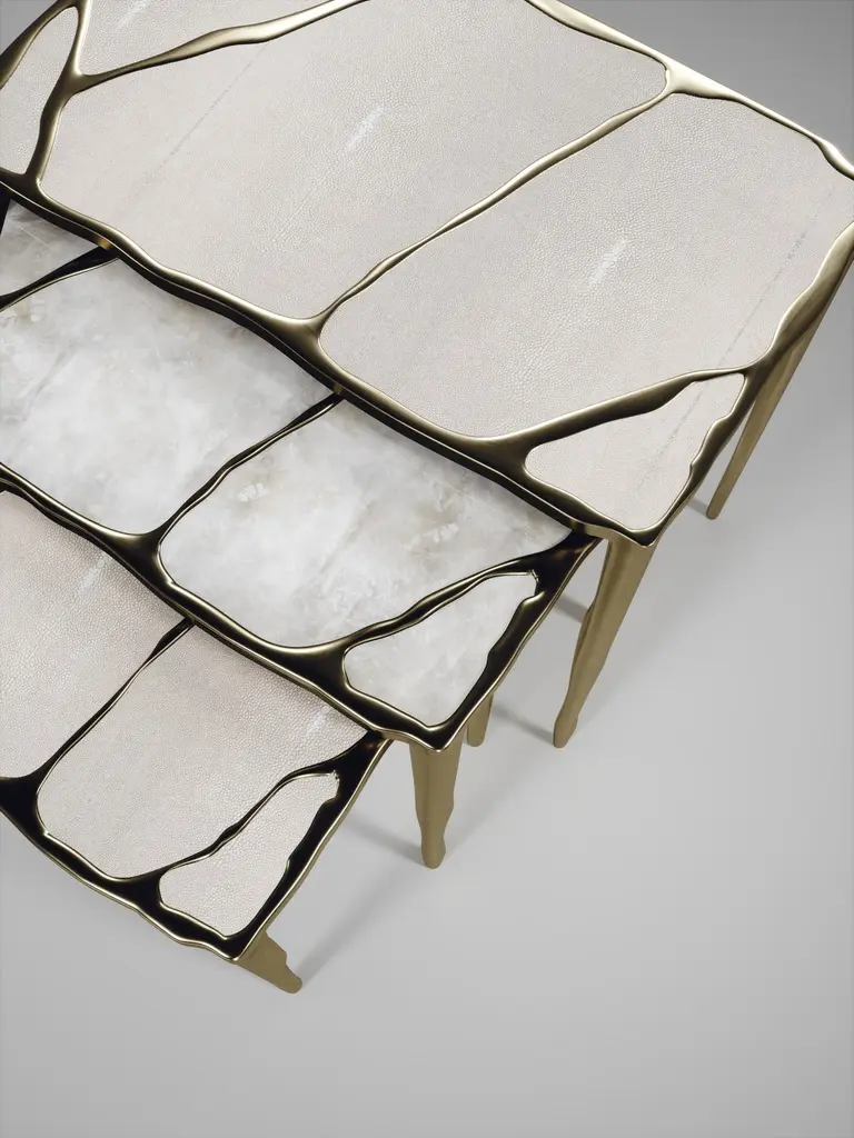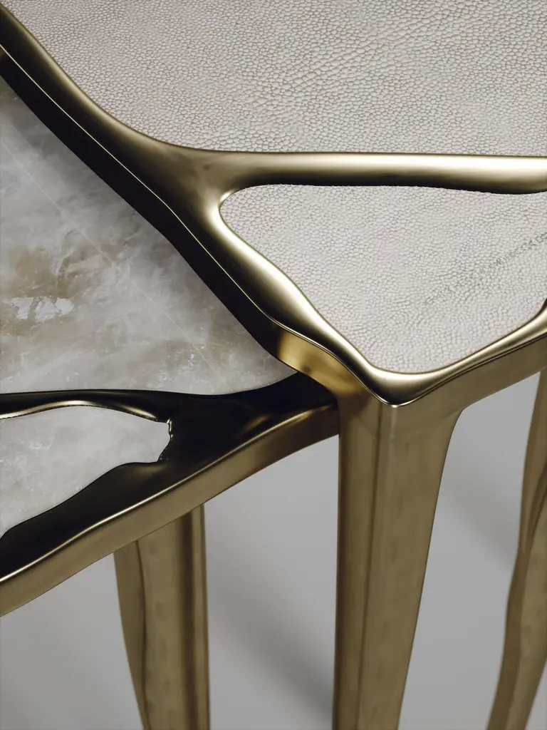 The Paris based label has distinguished themselves since their launch, with their iconic use of shagreen mixed with brass and other exotic materials. All furniture is handcrafted by skilled artisans, ultimately making each piece unique, designed in Paris and produced in the Philippines.The set of 3 melting II nesting side tables, are the perfect accent pieces for any living space. These are sold as a set of 3 to create elegant and geometric shapes, but one can purchase the tables on their own. The large and small size are inlaid in cream shagreen, the medium size inlaid in white quartz, and the tops are framed with an irregular surface bronze-patina brass that continues as a pattern on top surface as well as the shape pf the legs, which creates the "melting" effect against the inlay work. The melting pattern on the top surface is only raised by 3mm. These pieces come in a plain version as well, see images at end of slide. Available in different variations, see images at end of slide.The dimensions of this piece are:Small 7.25 x 14 x 20.75"Medium 20.5 x 13.75 x 19.75"Large 23.5 x 13.75 x 23.50"All R & Y Augousti pieces are handmade by artisans, ultimately making each piece unique. Custom color/sizing available on request. Wipe clean with soft dry cloth.Acclaimed design duo Ria & Yiouri Augousti have established themselves since the 1990s as pioneers of modern-vintage style through their luxurious Art Deco inspired collections.The Paris based label has distinguished themselves since their launch, with their iconic use of shagreen mixed with brass and other exotic materials. All furniture is handcrafted by skilled artisans, ultimately making each piece unique. All shagreen-covered items should be kept out of direct sunlight, color variants may occur on the stingray and other exotic finishes, but this showcases the Parisian label's commitment to creating authentic luxurious products using natural components.