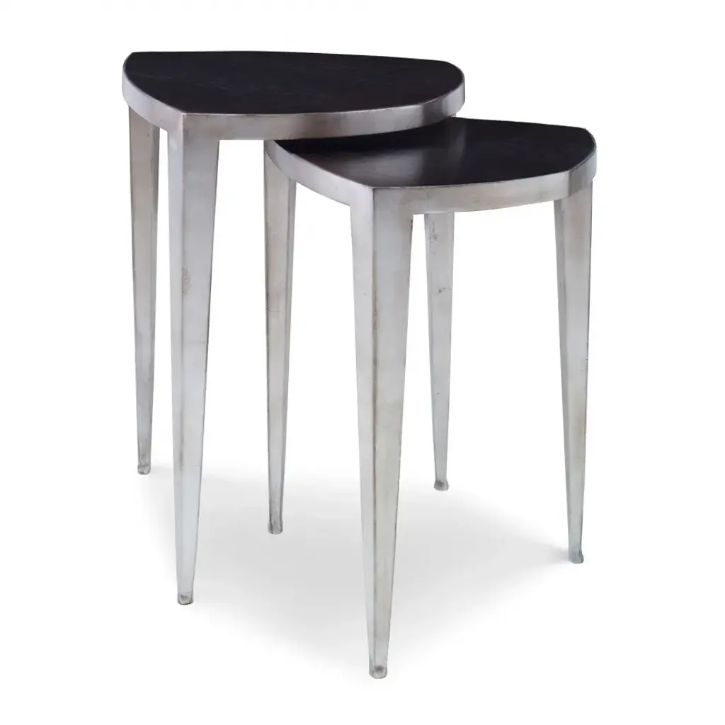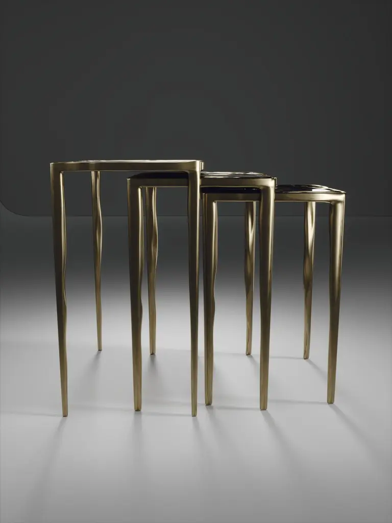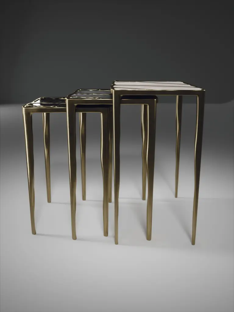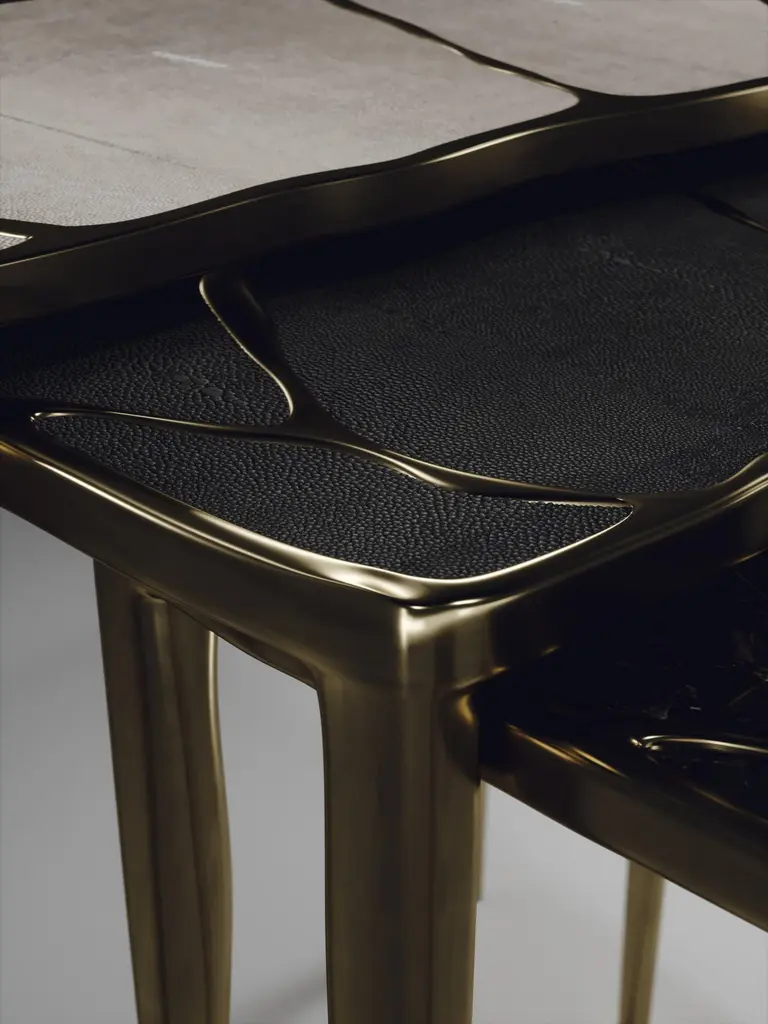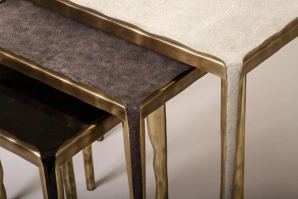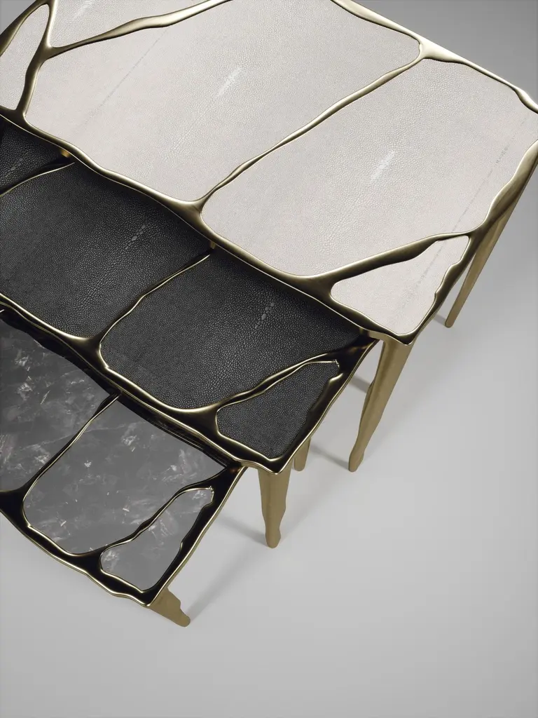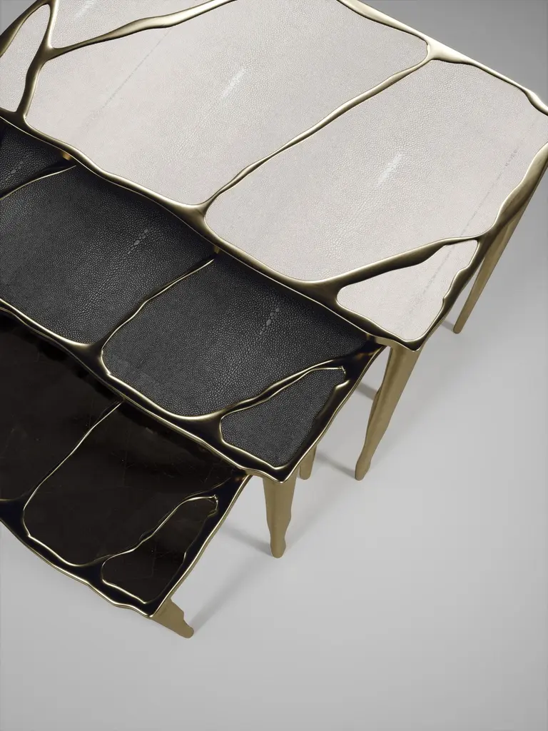 The Paris based label has distinguished themselves since their launch, with their iconic use of shagreen mixed with brass and other exotic materials. All furniture is handcrafted by skilled artisans, ultimately making each piece unique, designed in Paris and produced in the Philippines.The set of 3 melting II nesting side tables, are the perfect accent pieces for any living space. These are sold as a set of 3 to create elegant and geometric shapes, but one can purchase the tables on their own. The large and medium size are inlaid in cream and coal black shagreen respectively, the small size inlaid in black quartz, and the tops are framed with an irregular surface bronze-patina brass that continues as a pattern on top surface as well as the shape pf the legs, which creates the "melting" effect against the inlay work. The melting pattern on the top surface is only raised by 3mm. These pieces come in a plain version as well, see images at end of slide. Available with black shell instead of quartz, see images at end of slide. The dimensions of this piece are:Small 7.25 x 14 x 20.75"Medium 20.5 x 13.75 x 19.75"Large 23.5 x 13.75 x 23.50"All R & Y Augousti pieces are handmade by artisans, ultimately making each piece unique.Custom color/sizing available on request. Wipe clean with soft dry cloth.Acclaimed design duo Ria & Yiouri Augousti have established themselves since the 1990s as pioneers of modern-vintage style through their luxurious Art Deco inspired collections.The Paris based label has distinguished themselves since their launch, with their iconic use of shagreen mixed with brass and other exotic materials. All furniture is handcrafted by skilled artisans, ultimately making each piece unique. All shagreen-covered items should be kept out of direct sunlight, color variants may occur on the stingray and other exotic finishes, but this showcases the Parisian label's commitment to creating authentic luxurious products using natural components.