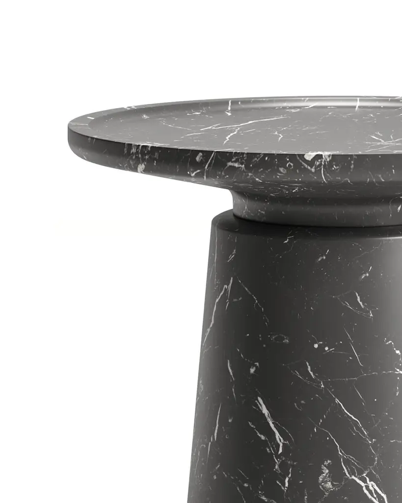 Coffee table in Black Marquinia marble, designed by the Spanish designer Ivan Colominas. An iconic table designed to remind us the luxurious ancient terraces of the Renaissance homes. The table is part of the Altana collection and it's available in different sizes and colours. Altana Small in Rosso Alicante marble and the Altana Large in Nero Marquinia marble. Commercial name: Altana MediumBlack Marquinia marble coffee table. Size: 54 (top diameter) x 54 (height) cm - round top - 21.2 ⌀ (top) x 21.2 in. No bordersLike the turret-like rooftop terraces we find in Renaissance homes, Altana is a table design that accepts no boundaries – round all-over, with no beginning nor end. Volume acting as a base and a flat tabletop – a depiction of the “terrace” from which objects can view their surroundings without the risk of falling.Made in Italy, hand finished.