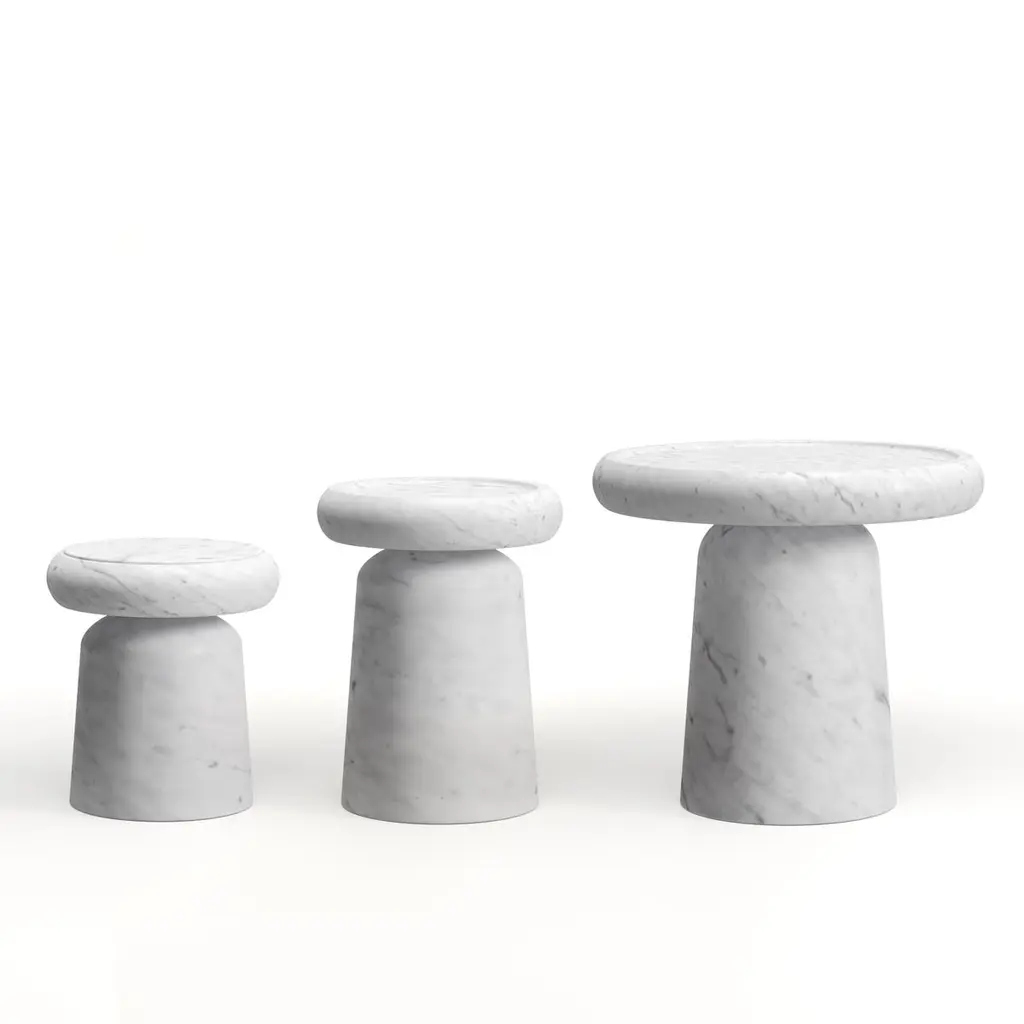 Side Table in White Gioia marbleSize: ⌀ 58 x 55 cm. - 22.8 x 21.7 in.Commercial name: Nissa Side Table in White Gioia marble, Nissa Collection by the Spanish designer Ivan Colominas. Made in Italy, hand finished.- available also in the S version- other colour versions available: Black Marquinia and Travertine A journey to the distant land of Nevsehir, a place away from time, in the wild and exotic Cappadocia, where you can lose yourself into an infinite nature, filling your eyes with marvel. The wonder of this exceptional landscape,inspires Ivan Colominas in the creation of a new collection. The memories of the wonderful rocks "Three Beauties", revives in the timeless design of Nissa, an elegant family composed of: dining table, stool, side table and a coffee table, where the quality of the material and of the craftsmanship are the essence. With MMairo's endlessly devotion to great design, Nissa Collection will make you dream with different forms and marbles. An exceptional travel into materials and shapes, to personalize your interior with undeniable exquisiteness.