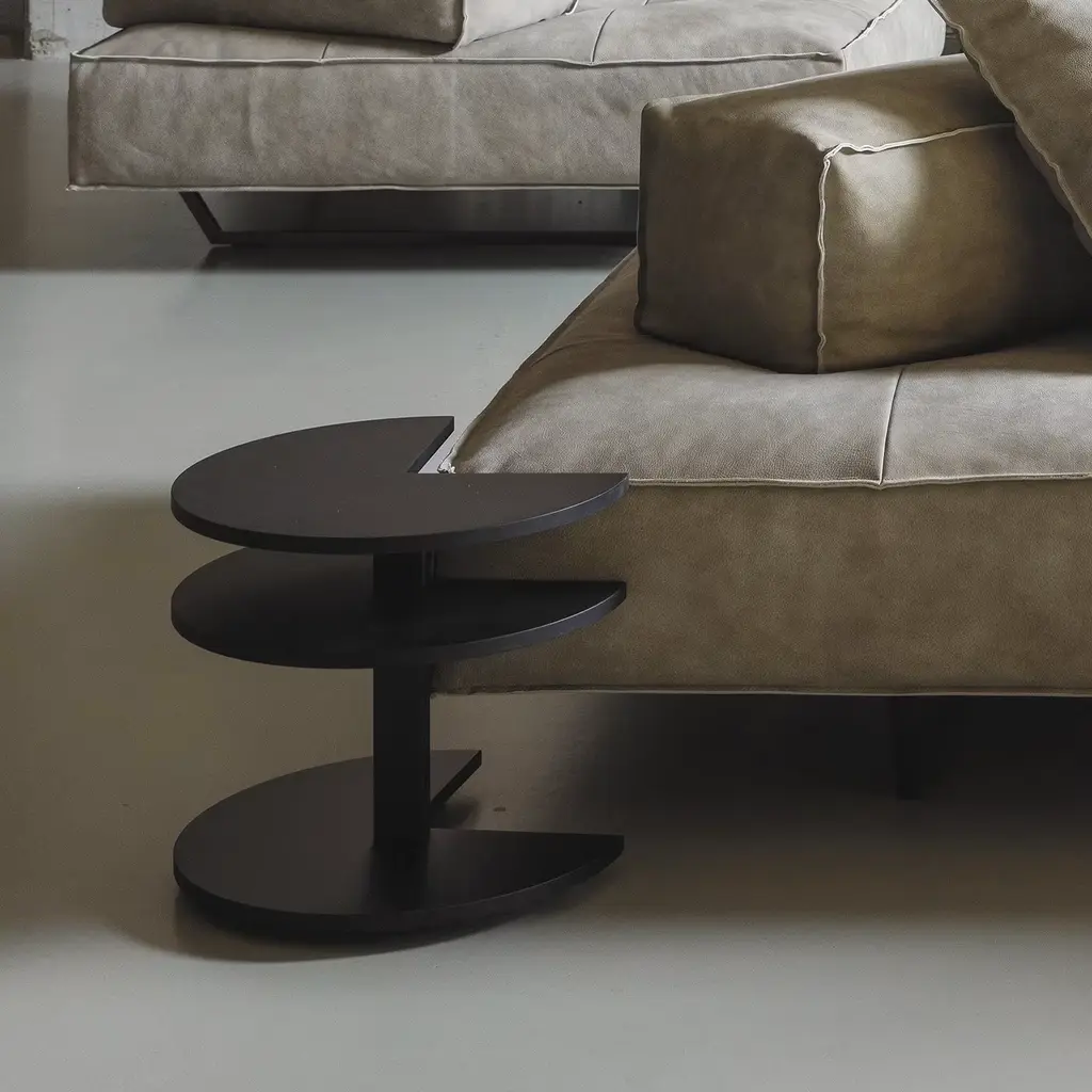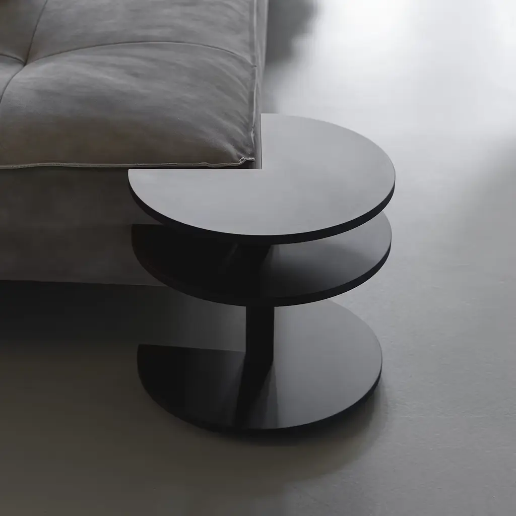 Timeless and versatile, this side table boasts a unique structure rising on three levels. Crafted of matte black-lacquered MDF, each level is marked by a round shape cut on one quarter to wedge in a sofa's corner.