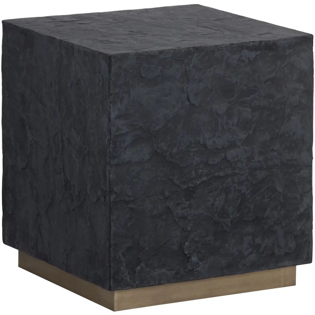 A bold concrete end table. Features an intricately crafted black or brown slate effect finish and completed with a 2" brushed brass base. Crafted from a natural concrete mix, each piece will look different. Variations in colour, texture, imperfections, surface scratches and non-structural hairline cracks are considered inherent and valued qualities of the material.