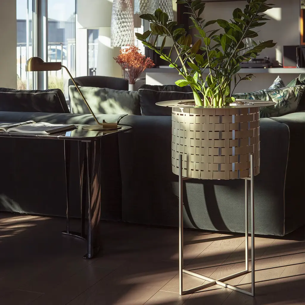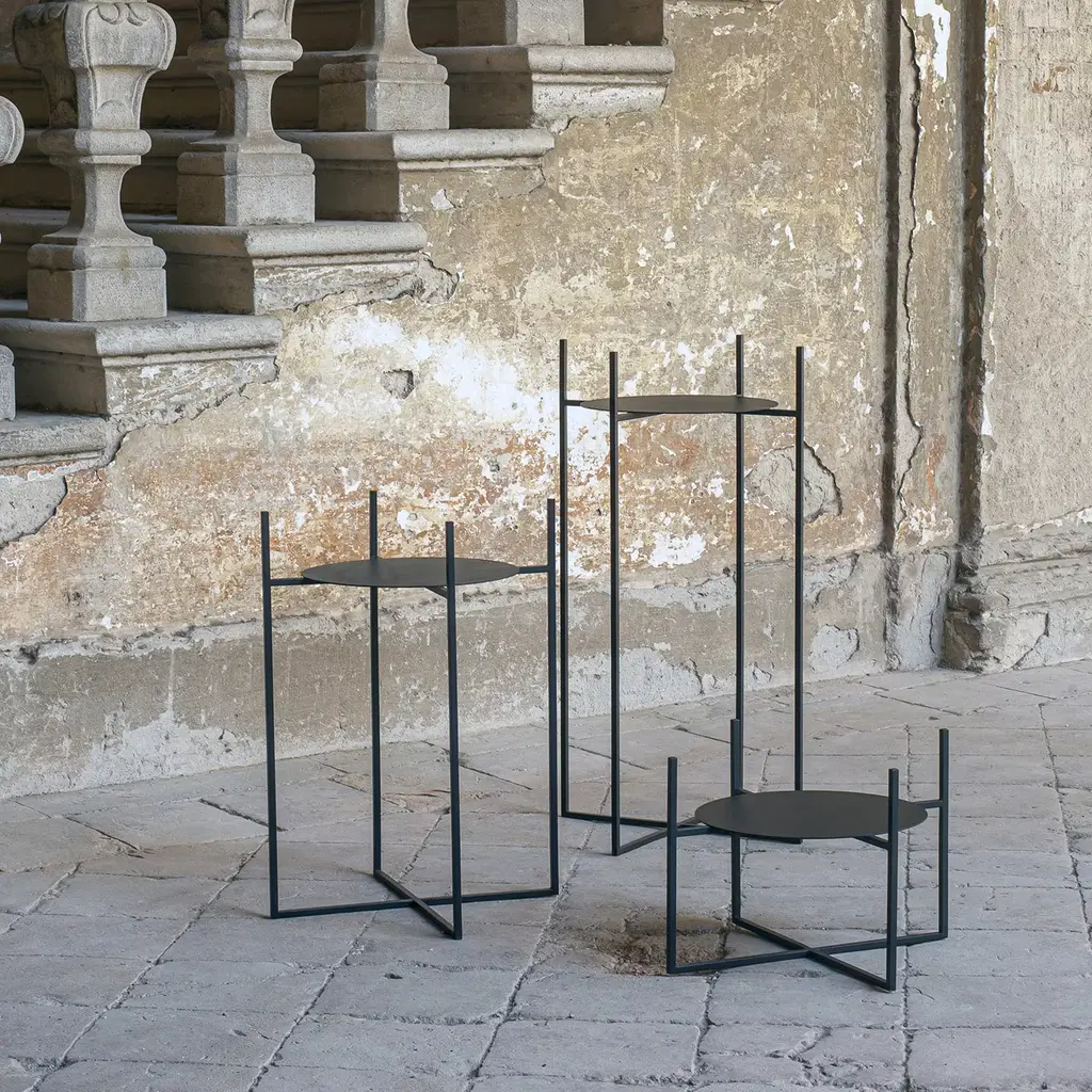 Clean lines of sophisticated geometric character define this gorgeous side table, a celebration of elegance and simplicity. Ideally complementing a living room decor, flanking a refined sofa of contemporary sophistication, embellished with vases, statuettes, or magazines, it is entirely handcrafted of black-lacquered iron. Customizable in size and color. It is possible to purchase separately the cachepot. Please consult the Concierge for options.