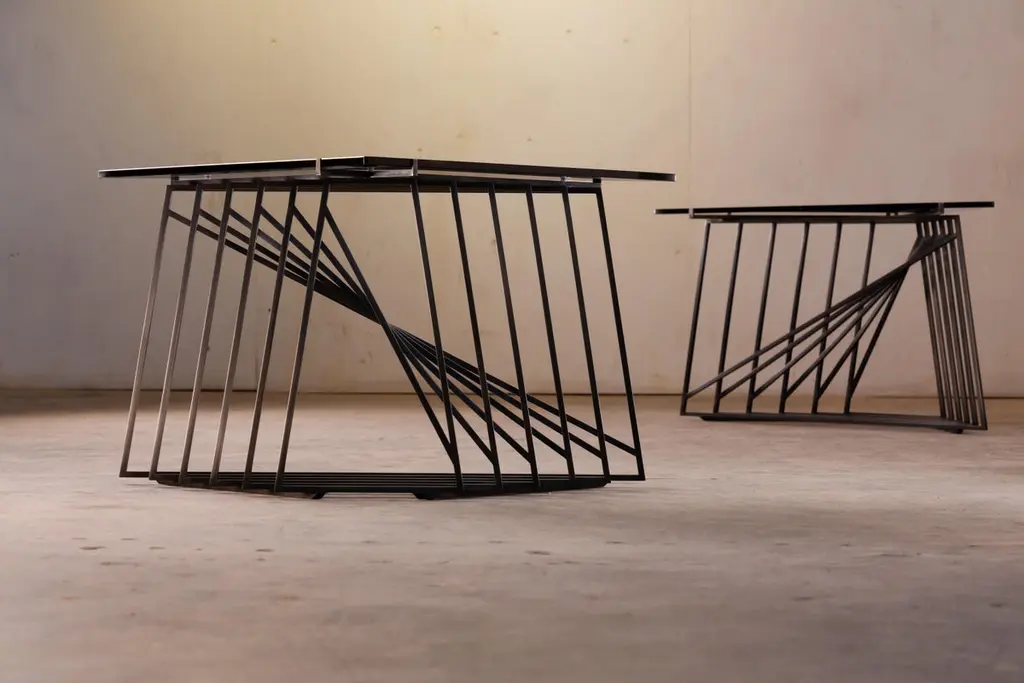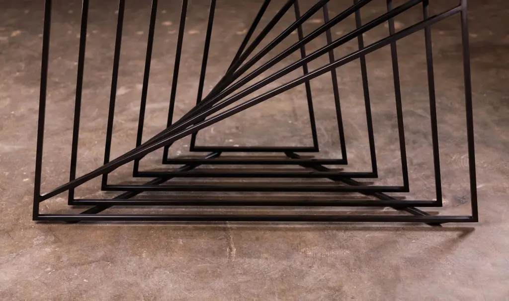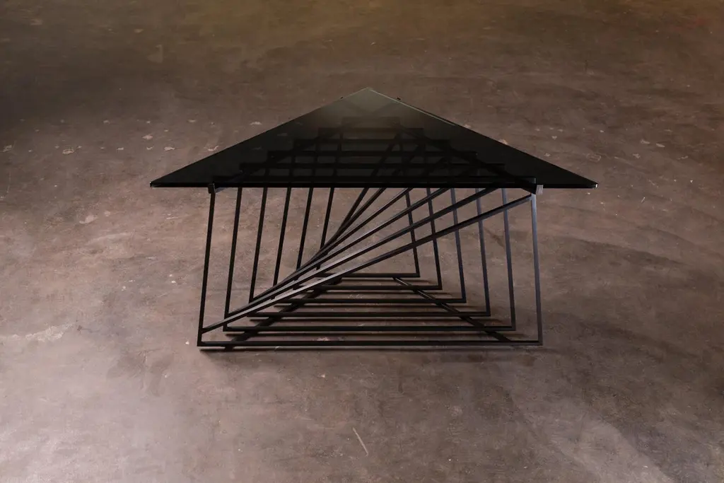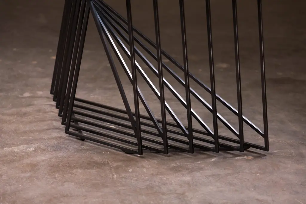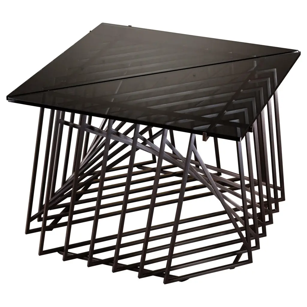 The Nexus Side Tables are a sculptural study, finely constructed and finished with satin black oxide steel and smoked gray glass. Versatile and modular, the triangular tables can be fully customized to be used independently, as a square duo, an asymmetric trio, or dispersed individually throughout the home. Using geometric repetition and proportional scale for visual impact, the Nexus End Tables are a nod to playful perspectives and spatial relationships. They are intended as functional art furniture to elevate the home. In keeping with Force/Collide's signature style, various perspectives reveal shifting points of connection and present metal as a fluid material. The effect is exponential when tables are creatively combined as a set.The Nexus End Tables are designed and made-to-order by Force/Collide in our Seattle, WA studio.
