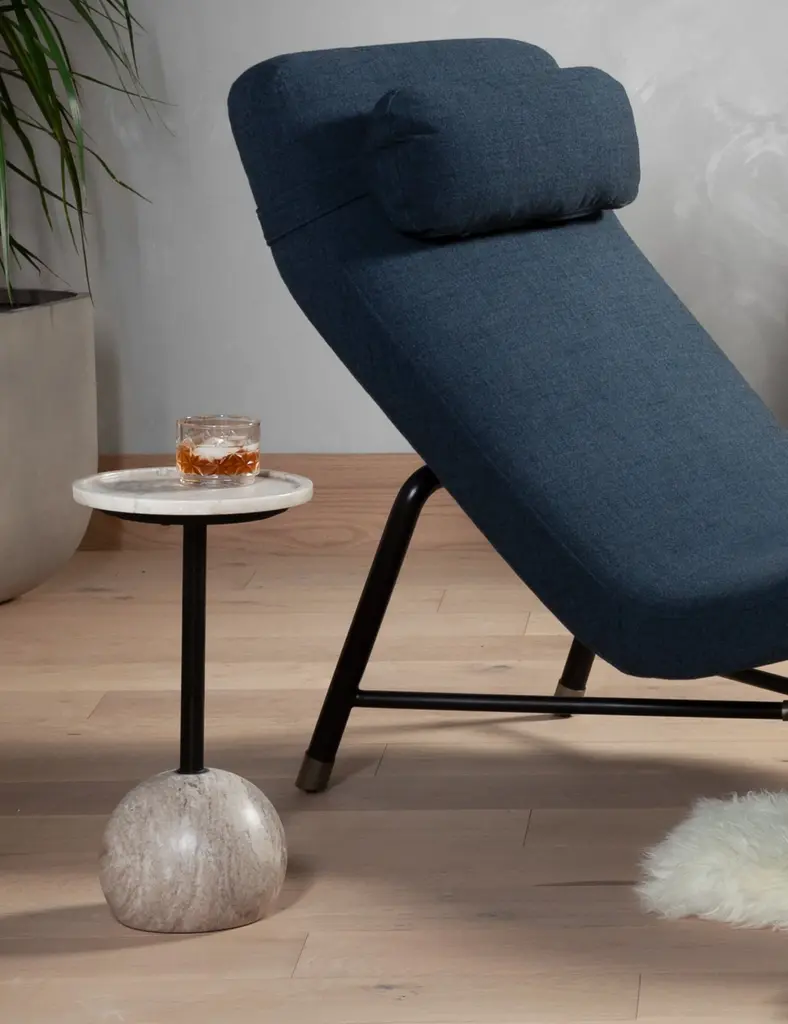 Poised for elegance, the Nicholas side table brings a touch of polish to any space. A marble orb holds an iron post, bolstering the round tray top in this sturdy end table design, offering sophistication with a practical touch.