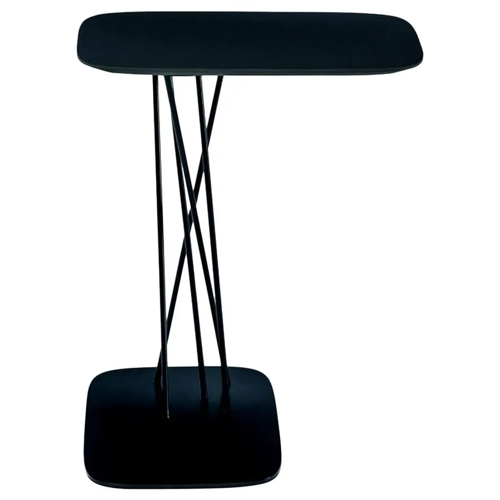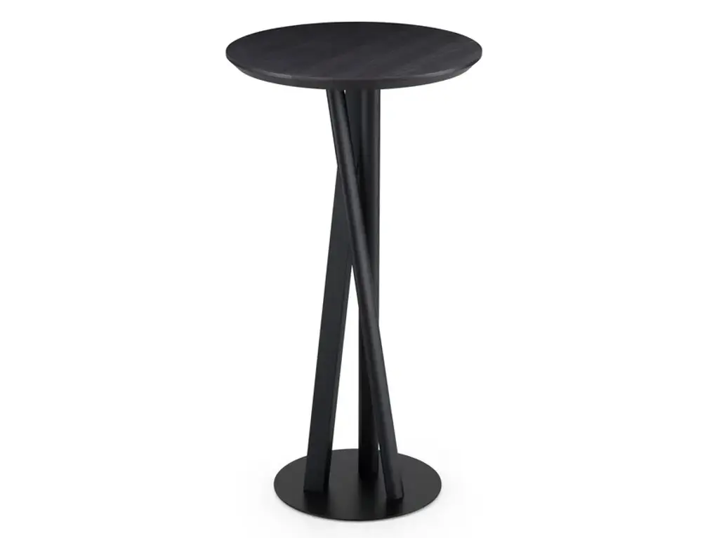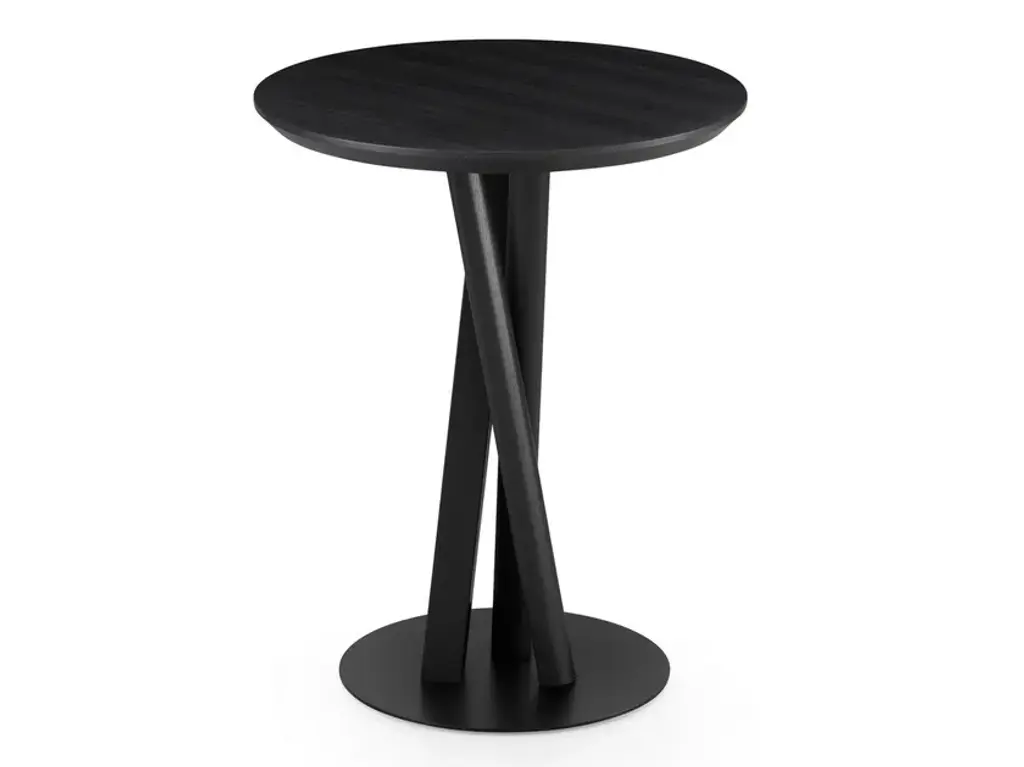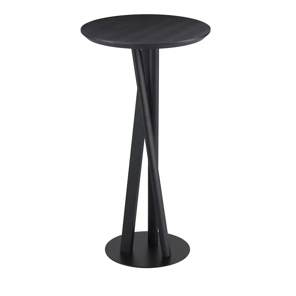 Boasting an elegant total-black look, this side table is ideal for both residential and commercial interior decors. The innovative structure features three crisscrossed legs boasting different geometric silhouettes: round, oval, and squared, for a superbly eclectic look. The round platform in metal recalls the round top, and the whole structure is crafted of solid ash wood. The piece is customizable in height and shape of top upon request, ask the Concierge for details.