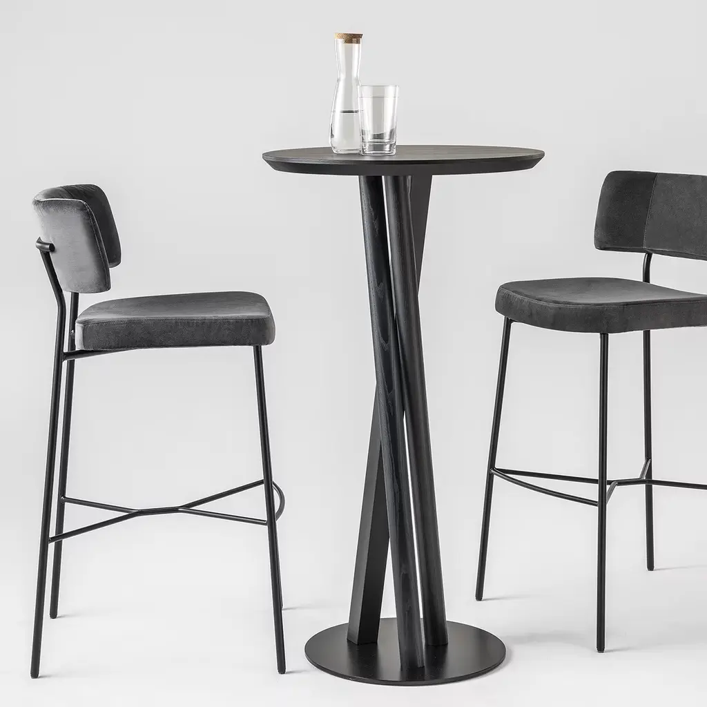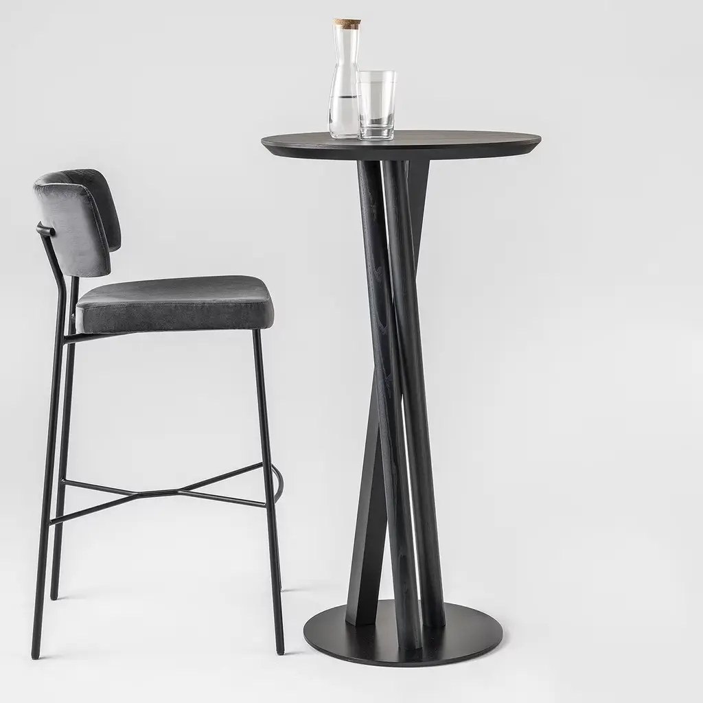 An unconventional design by architect and designer Massimo Broglio, this tall side table will be perfect to enjoy a drink or snack in a lounge or private study. Boasting a total-black look, it combines ash wood and metal in a striking silhouette composed of three crisscrossed legs featuring different geometric shapes (round, oval, and squared). Eclectic and versatile, this design is completed by a round metal base and top. This side table is customizable in height and shape of the top, please ask the Concierge for additional details.