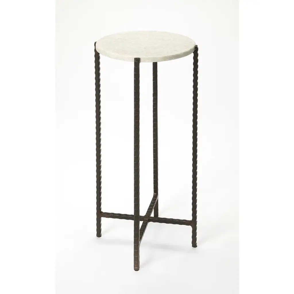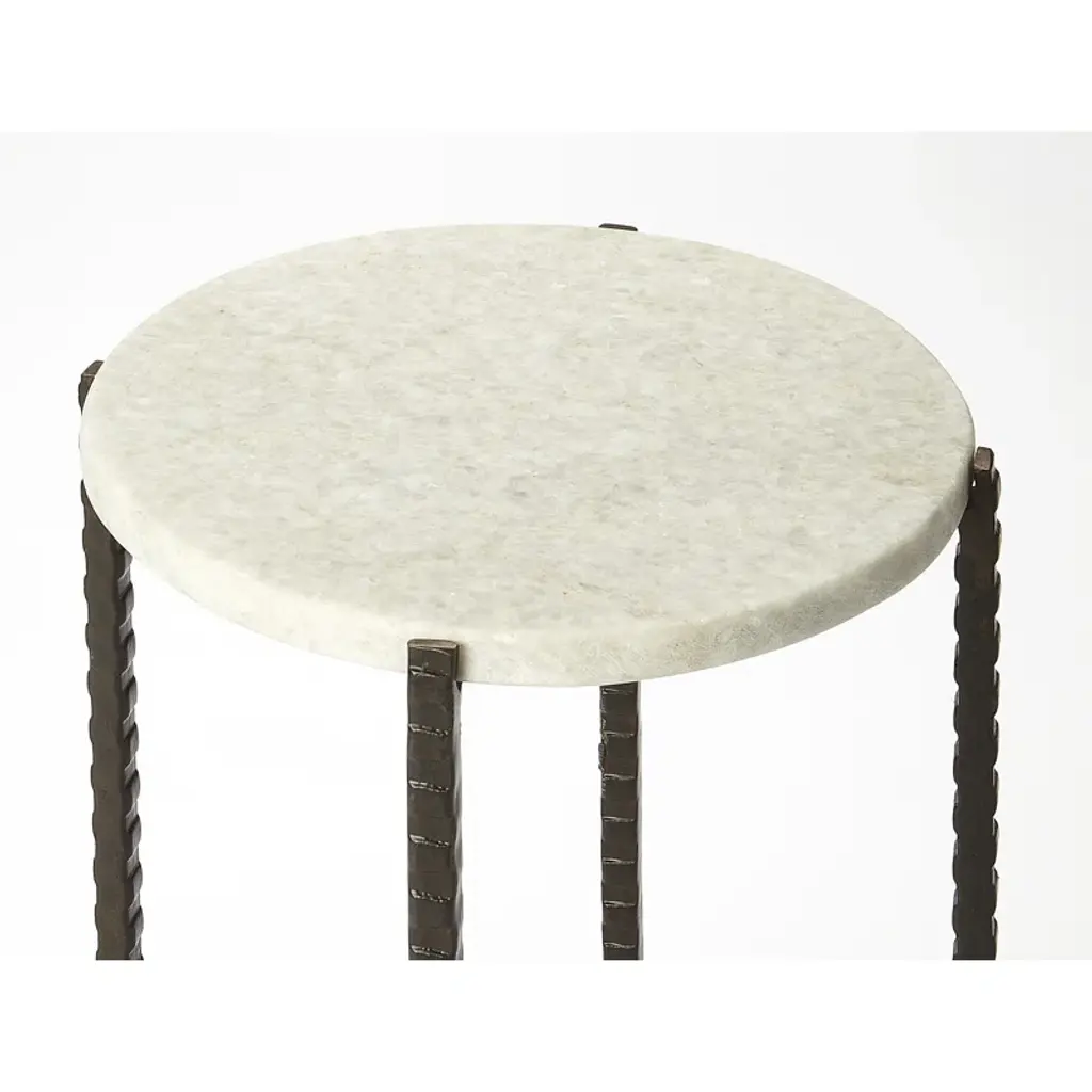 This plain and simple round, metal and marble accent table is nothing less than fashionable. The twisted iron legs support a smooth white marble slab. This table is functional and allows for your needs; in style and space. Use it in pairs as petite end tables flanking your modern sofa, or set it in the entry with a basket atop to catch your keys.
