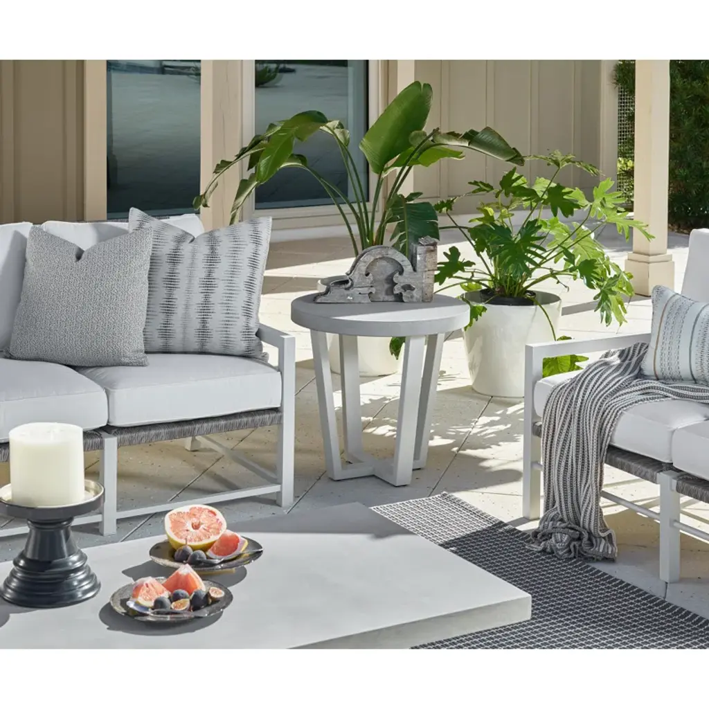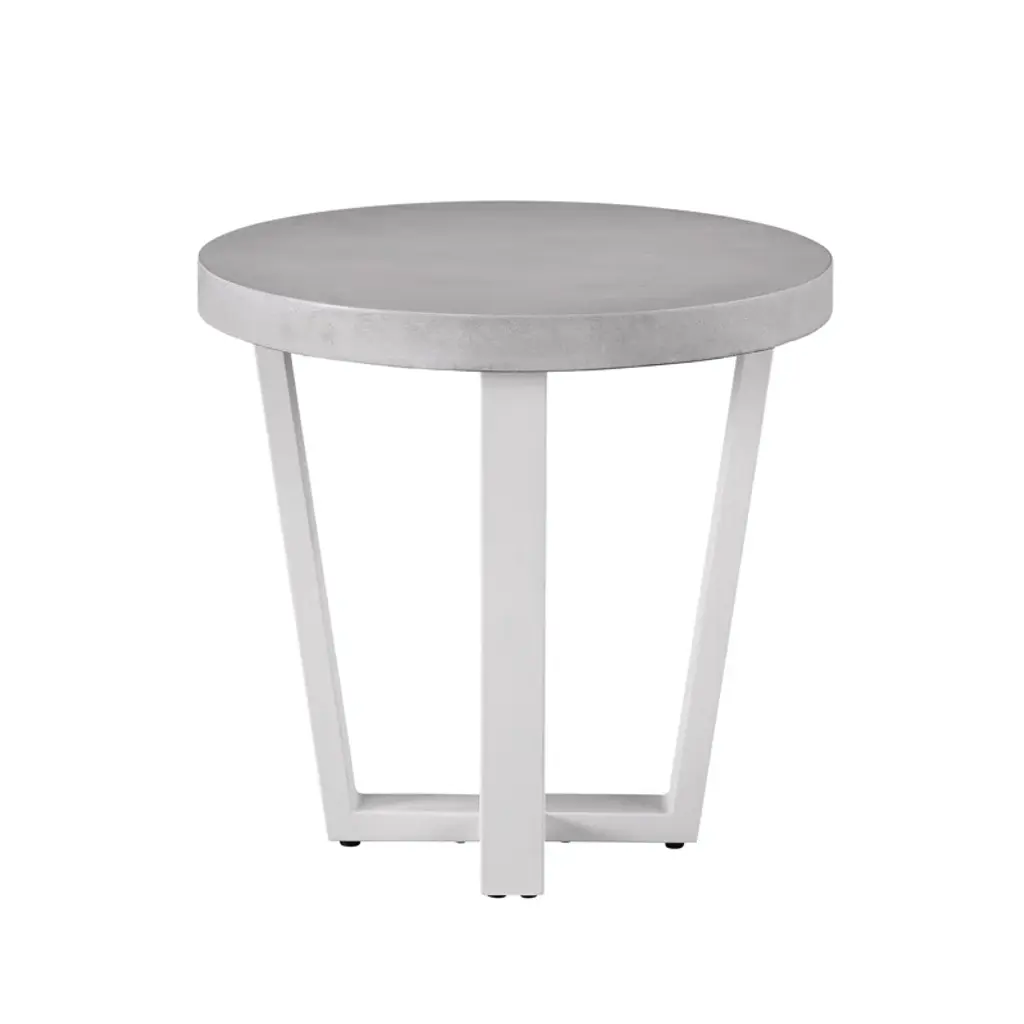 This is a compliment on outdoor sofas and side chairs with the Nightingale patio table, a two-toned stunner built with a rounded concrete top supported by a white aluminum base.