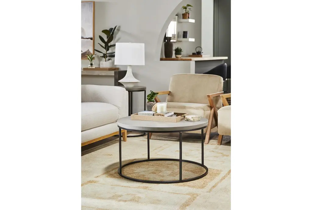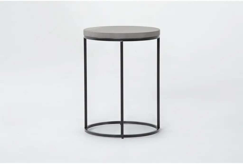 The Niles Grey 18" Wide Round Cement Top & Metal Base End Table offers a stylish addition to your living room. This modern table features a grey fiber cement top paired with a sleek black metal base, creating a contemporary look that complements any decor. Its small size and round shape make it perfect for use as a side or accent table in various spaces.