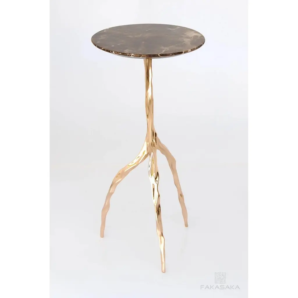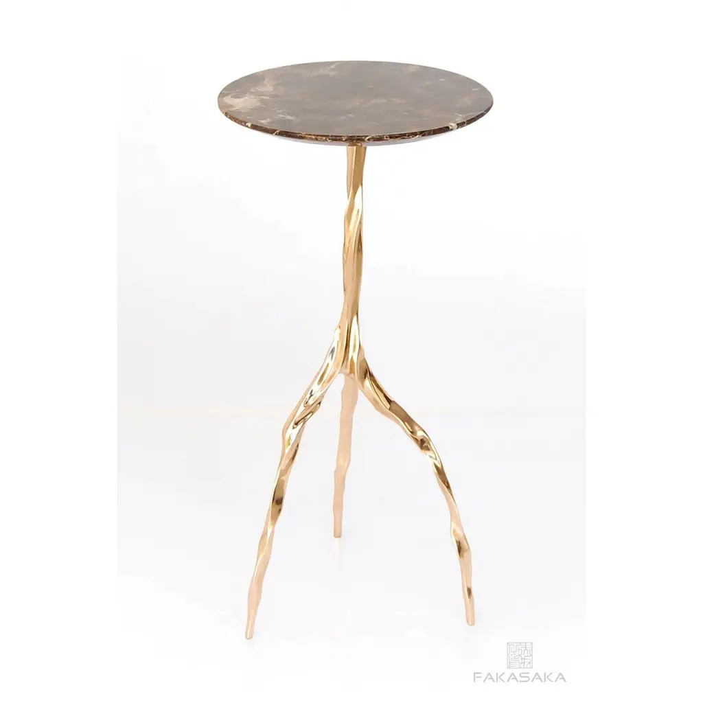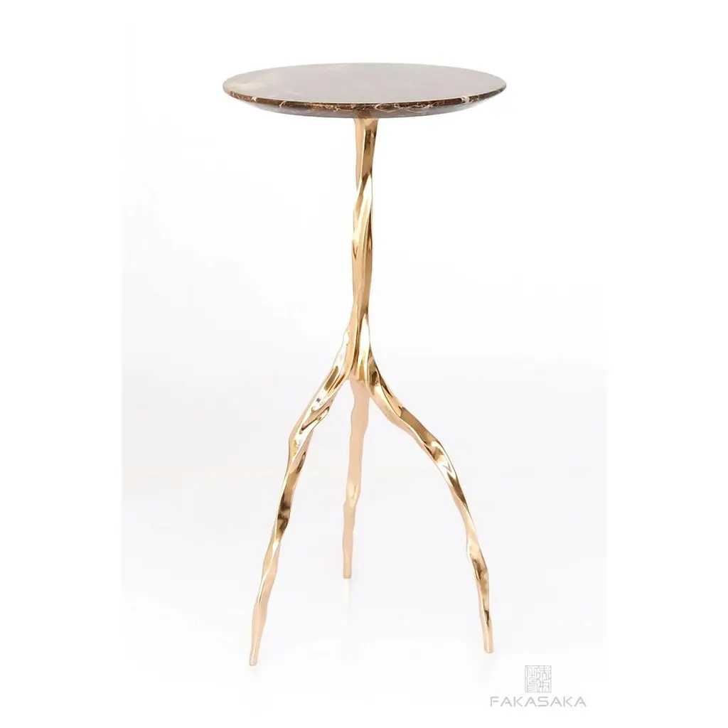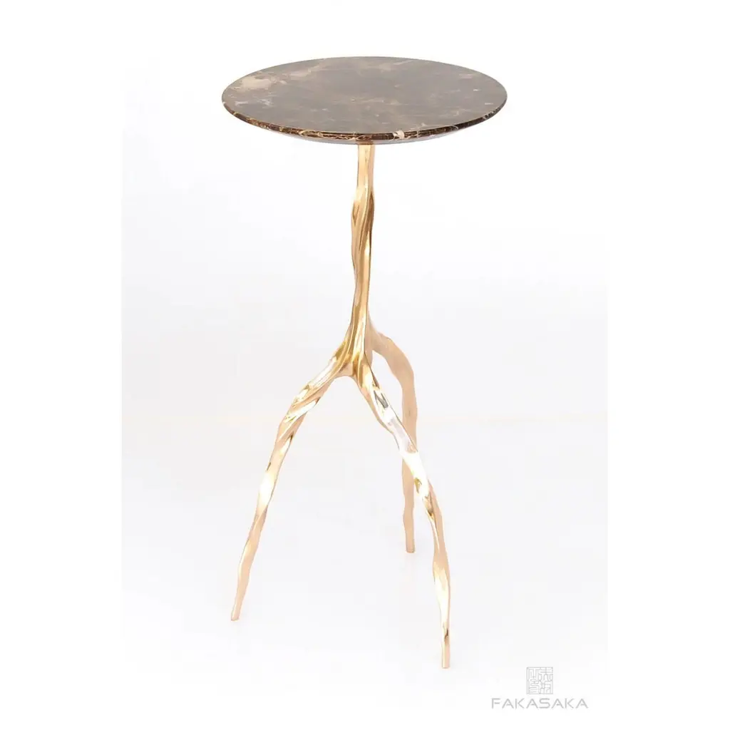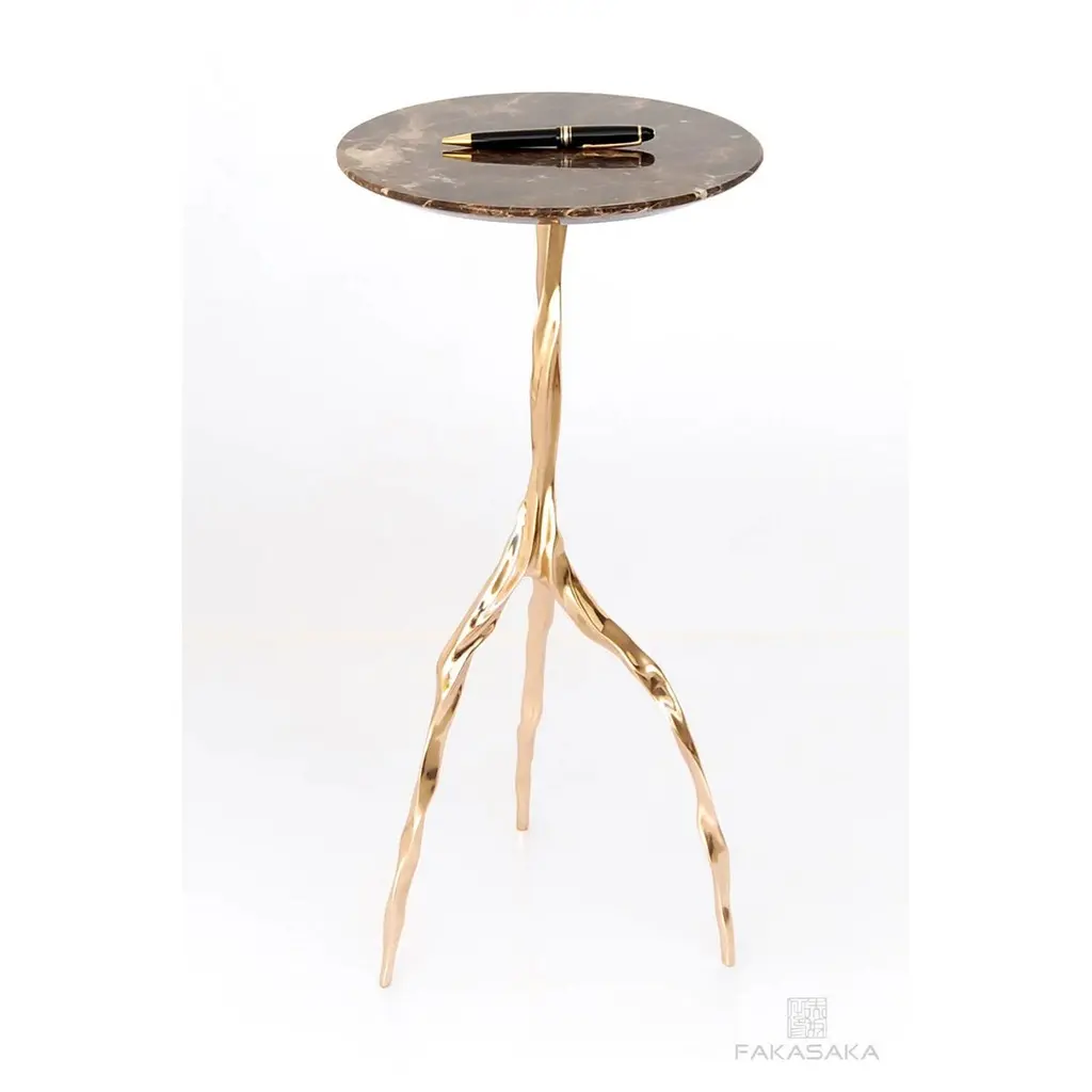 Nina drink table with Marrom Imperial marble top by Fakasaka DesignDimensions: W 30 cm, D 30 cm, H 62 cm.Materials: polished bronze base, Marron Imperial Marble top. Also available in different table top materials:Nero Marquina Marble Marrom Imperial MarblePedra AgateTranslucent OnyxBase: polished or dark bronze. FAKASAKA is a design company focused on production of high-end furniture, lighting, decorative objects, jewels, and accessories. Established in 2007, Fakasaka is the eponymous design company by Brazilian artist Fernando Akasaka distinguished by a penchant for producing intricate detailed cast bronze collectible design objects, furniture and jewelries. Fakasaka explores the contrast between the manmade and the natural through shapes and finishes that create a clear aesthetic. The constant challenge to balance elements is met with an outcome that is a striking assortment of bronze furniture and objects in oxidised and polished finishes, accented with precious regional stones, granites and rich prehistoric reptilian motifs.