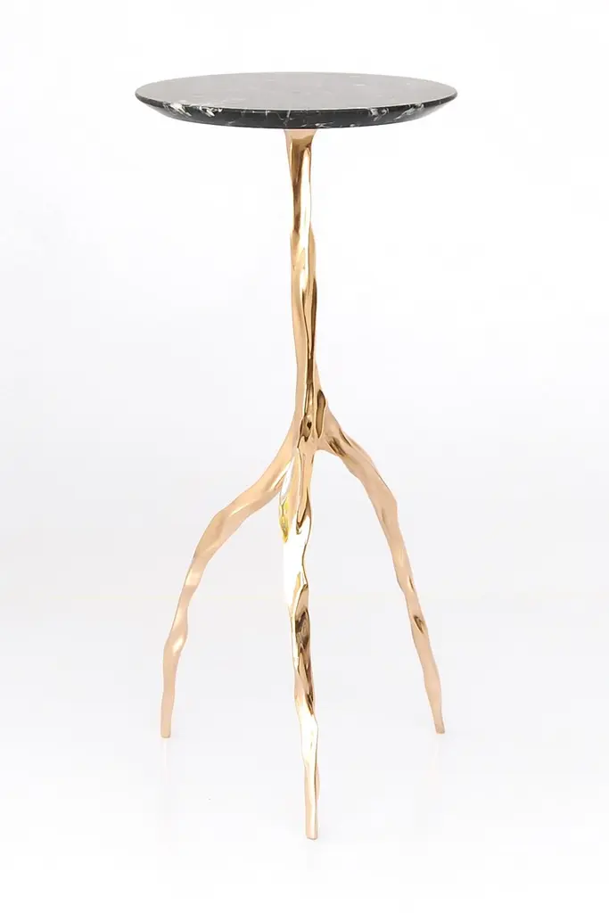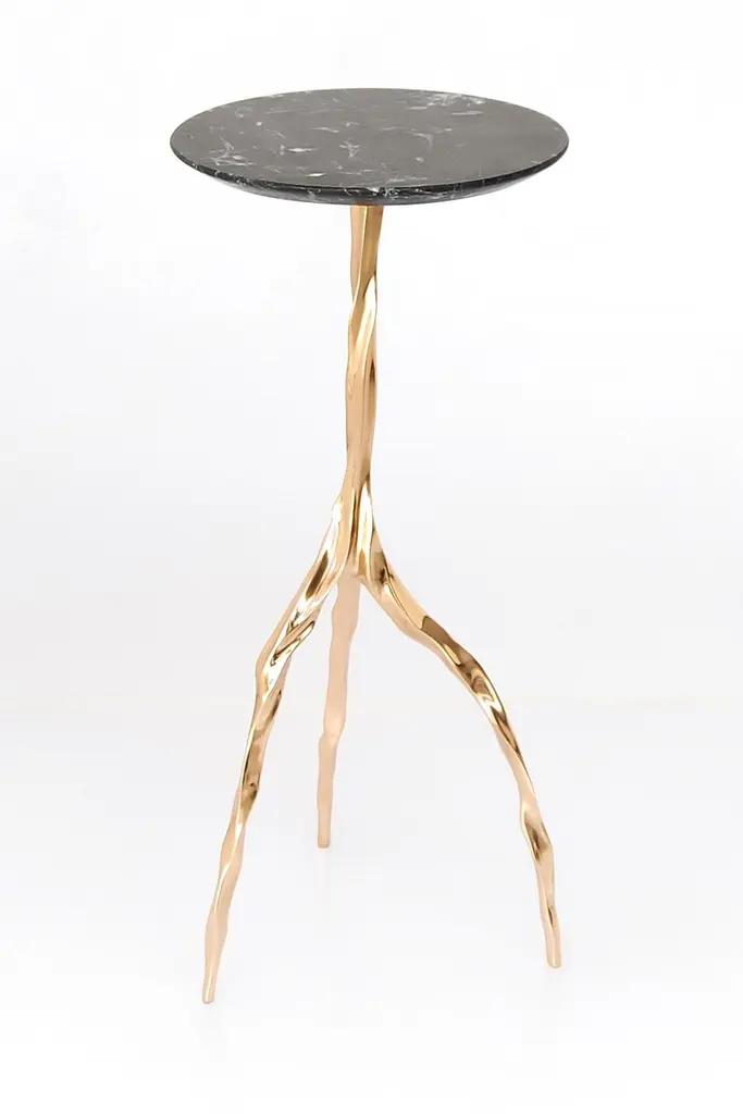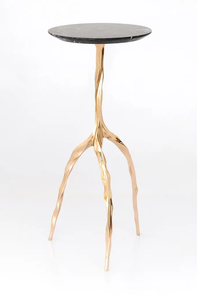 Nina drink table with Nero Marquina marble by Fakasaka DesignDimensions: W 30 cm, D 30 cm, H 62 cm.Materials: polished bronze base, Nero Marquina Marble top. Also available in different table top materials:Nero Marquina Marble Marrom Imperial MarblePedra AgateTranslucent OnyxBase: polished or dark bronze. FAKASAKA is a design company focused on production of high-end furniture, lighting, decorative objects, jewels, and accessories.Established in 2007, Fakasaka is the eponymous design company by Brazilian artist Fernando Akasaka distinguished by a penchant for producing intricate detailed cast bronze collectible design objects, furniture and jewelries. Fakasaka explores the contrast between the manmade and the natural through shapes and finishes that create a clear aesthetic. The constant challenge to balance elements is met with an outcome that is a striking assortment of bronze furniture and objects in oxidised and polished finishes, accented with precious regional stones, granites and rich prehistoric reptilian motifs.