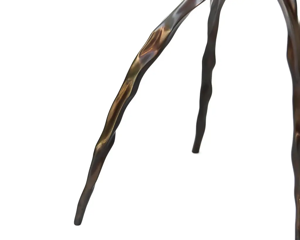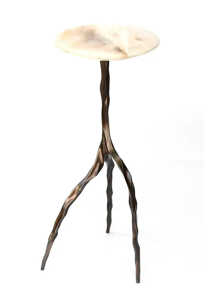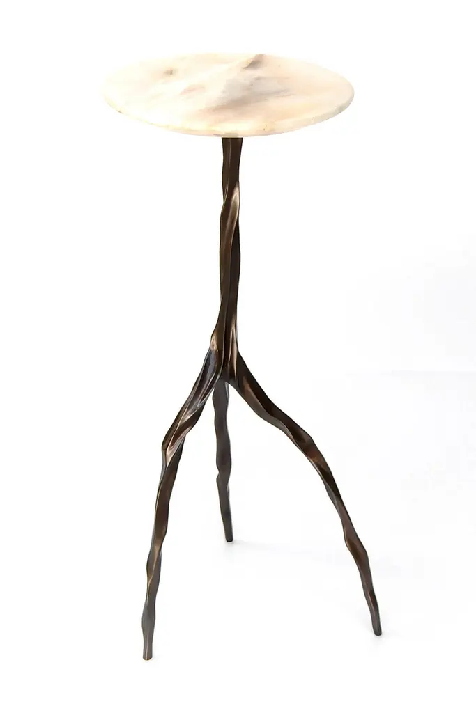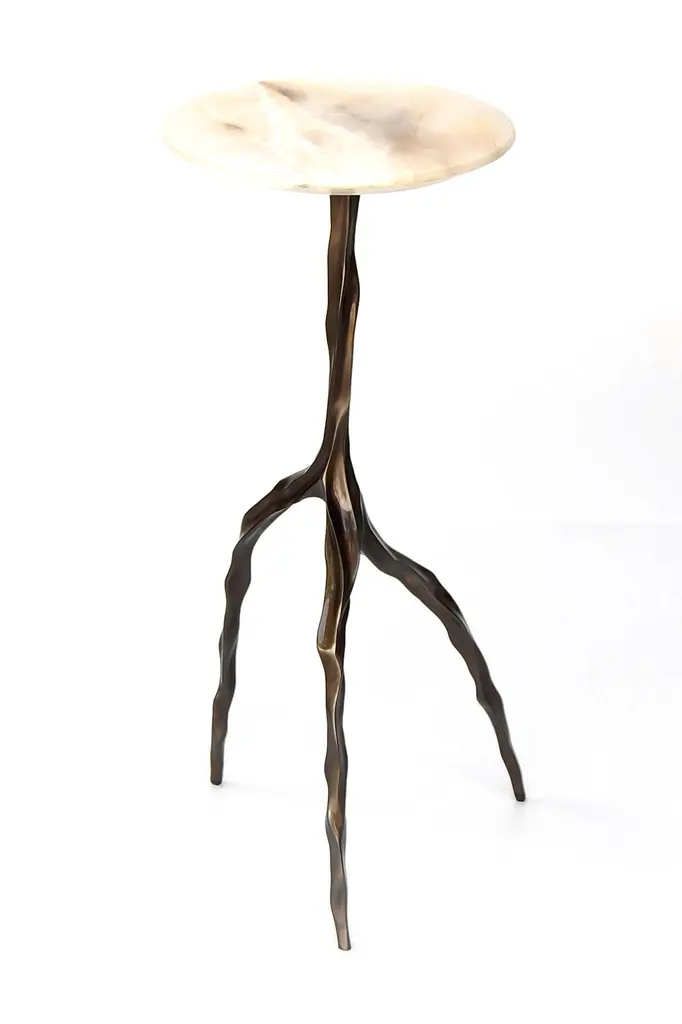 Nina drink table with onyx top by Fakasaka DesignDimensions: W 30 cm, D 30 cm, H 62 cm.Materials: dark bronze base, translucent onyx top. Also available in different table top materials:Nero Marquina Marble Marrom Imperial MarblePedra AgateTranslucent OnyxBase: polished or dark bronze. FAKASAKA is a design company focused on production of high-end furniture, lighting, decorative objects, jewels, and accessories. Established in 2007, Fakasaka is the eponymous design company by Brazilian artist Fernando Akasaka distinguished by a penchant for producing intricate detailed cast bronze collectible design objects, furniture and jewelries. Fakasaka explores the contrast between the manmade and the natural through shapes and finishes that create a clear aesthetic. The constant challenge to balance elements is met with an outcome that is a striking assortment of bronze furniture and objects in oxidised and polished finishes, accented with precious regional stones, granites and rich prehistoric reptilian motifs.