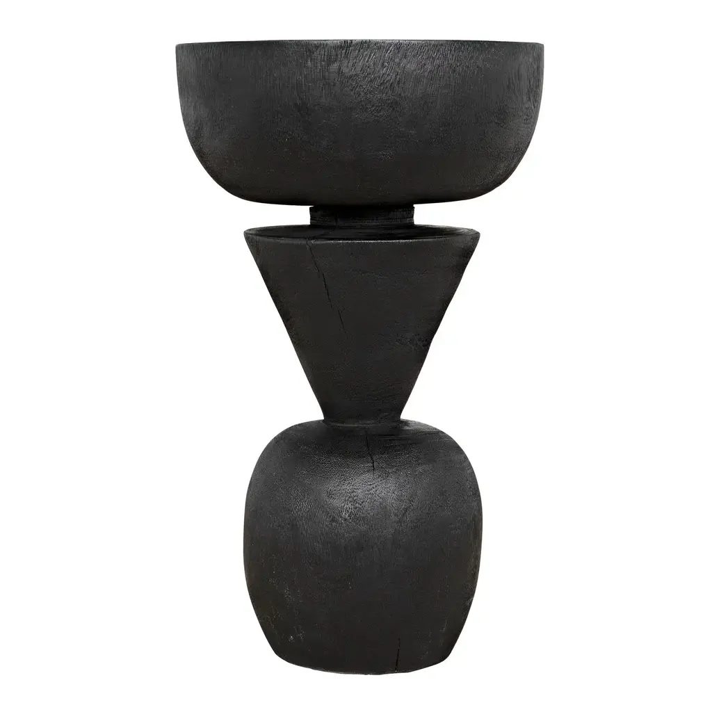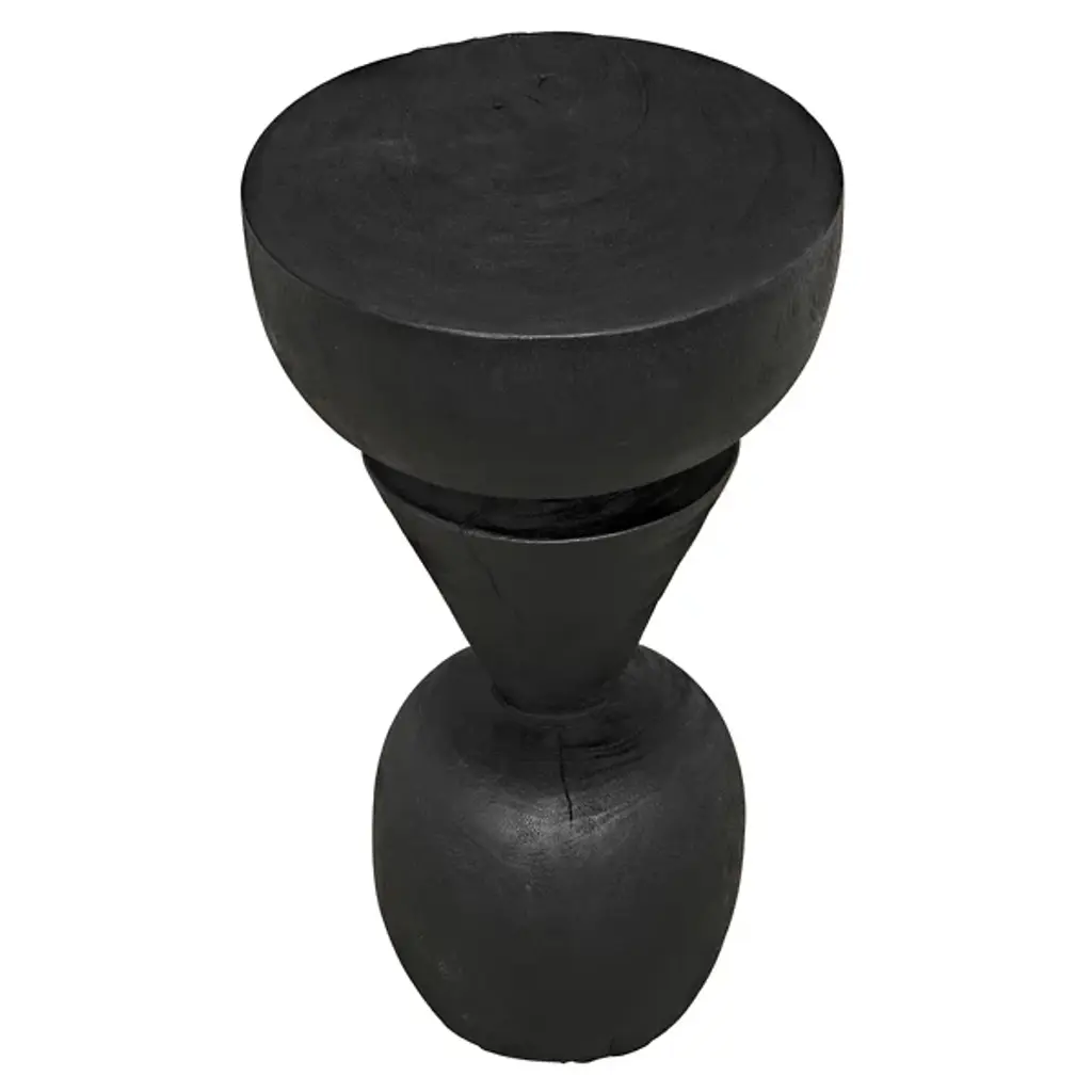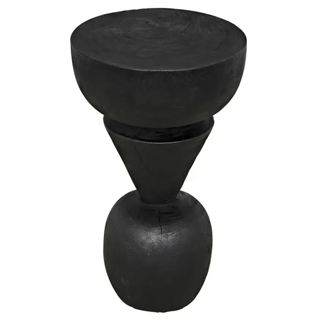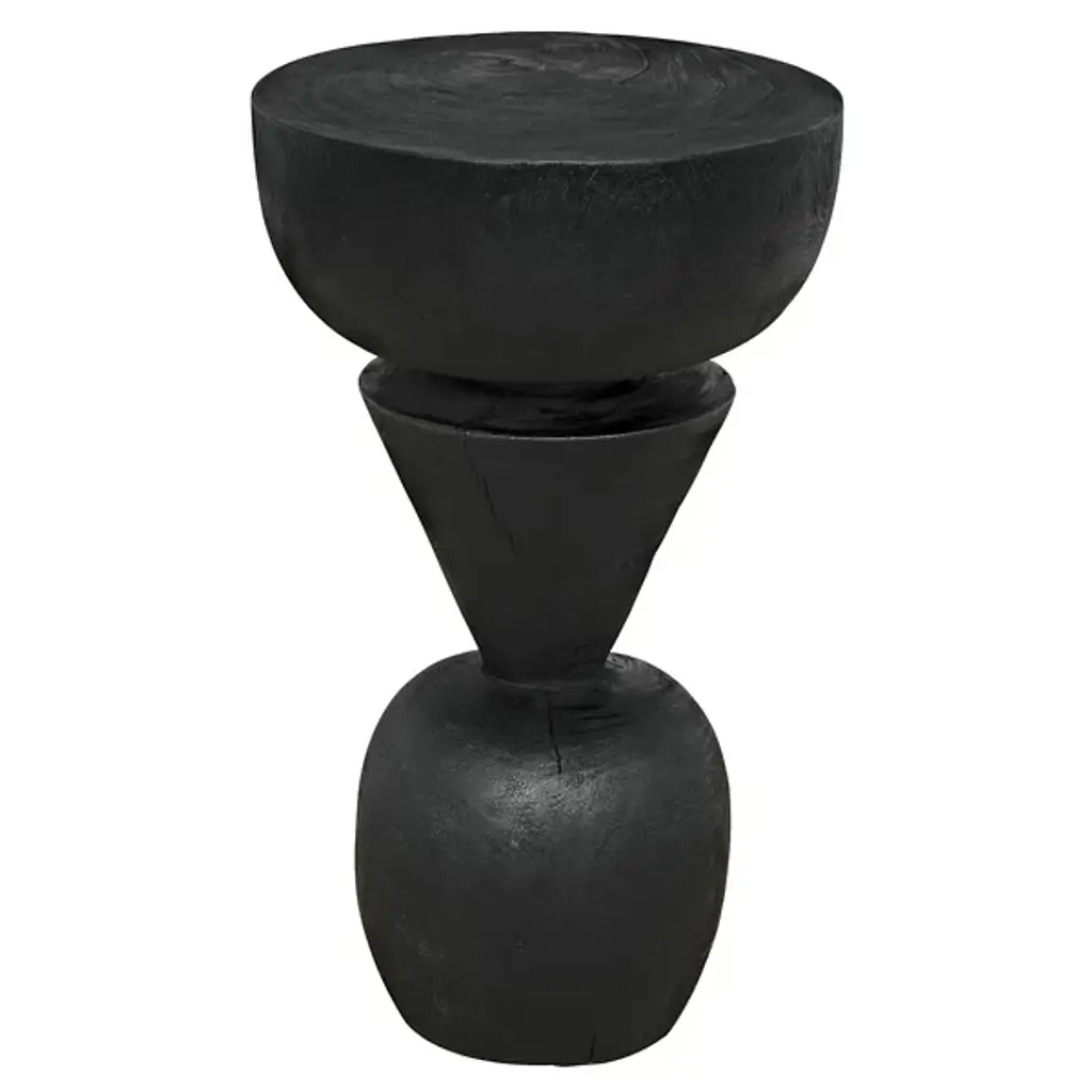 The Nogozi Side Table from Noir balances geometric elements in a playful stacked composition. Munggur wood shaped into varied rounded forms creates an almost totemic presence that draws the eye upward. The burnt finish highlights the intricate wood grain while unifying the distinct segments. A conical middle section creates a dynamic tension between the substantial top and base, defying the expectations of traditional table design. This unconventional approach transforms a utilitarian object into a conversation piece with a strong sculptural presence. Despite its artistic nature, the flat upper surface remains entirely functional for displaying decorative objects or accommodating daily essentials. An imaginative alternative to predictable accent furniture.