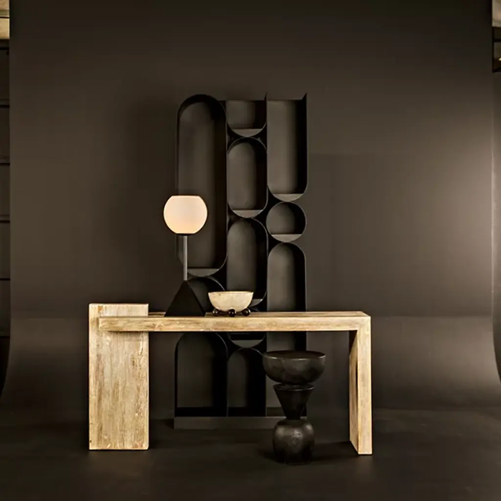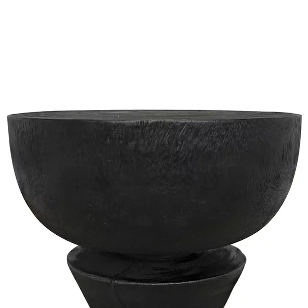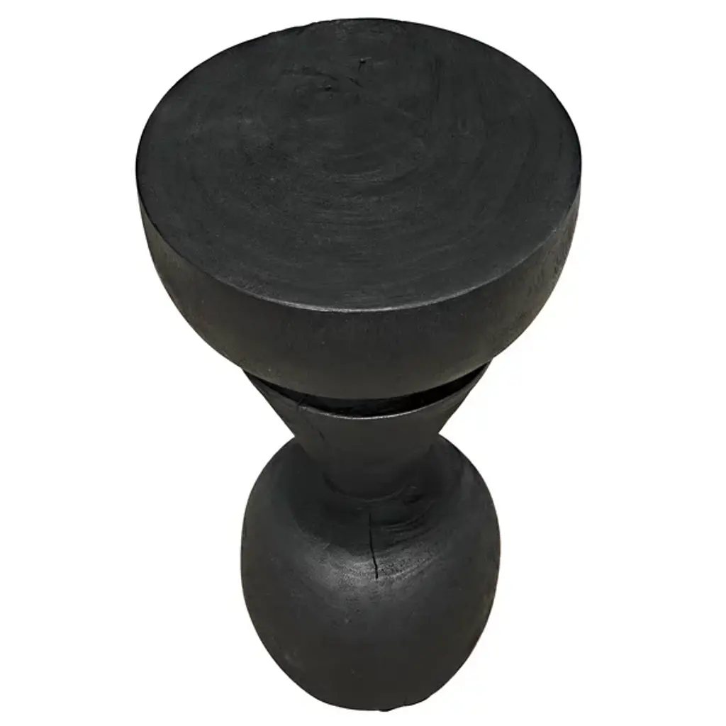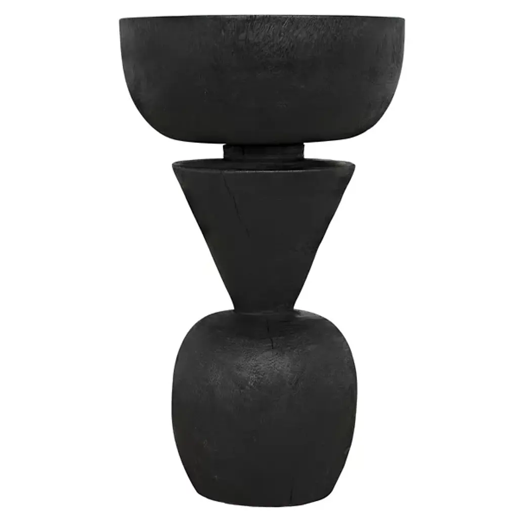 The Nogozi Side Table from Noir balances geometric elements in a playful stacked composition. Munggur wood shaped into varied rounded forms creates an almost totemic presence that draws the eye upward. The burnt finish highlights the intricate wood grain while unifying the distinct segments. A conical middle section creates a dynamic tension between the substantial top and base, defying the expectations of traditional table design. This unconventional approach transforms a utilitarian object into a conversation piece with a strong sculptural presence. Despite its artistic nature, the flat upper surface remains entirely functional for displaying decorative objects or accommodating daily essentials. An imaginative alternative to predictable accent furniture.