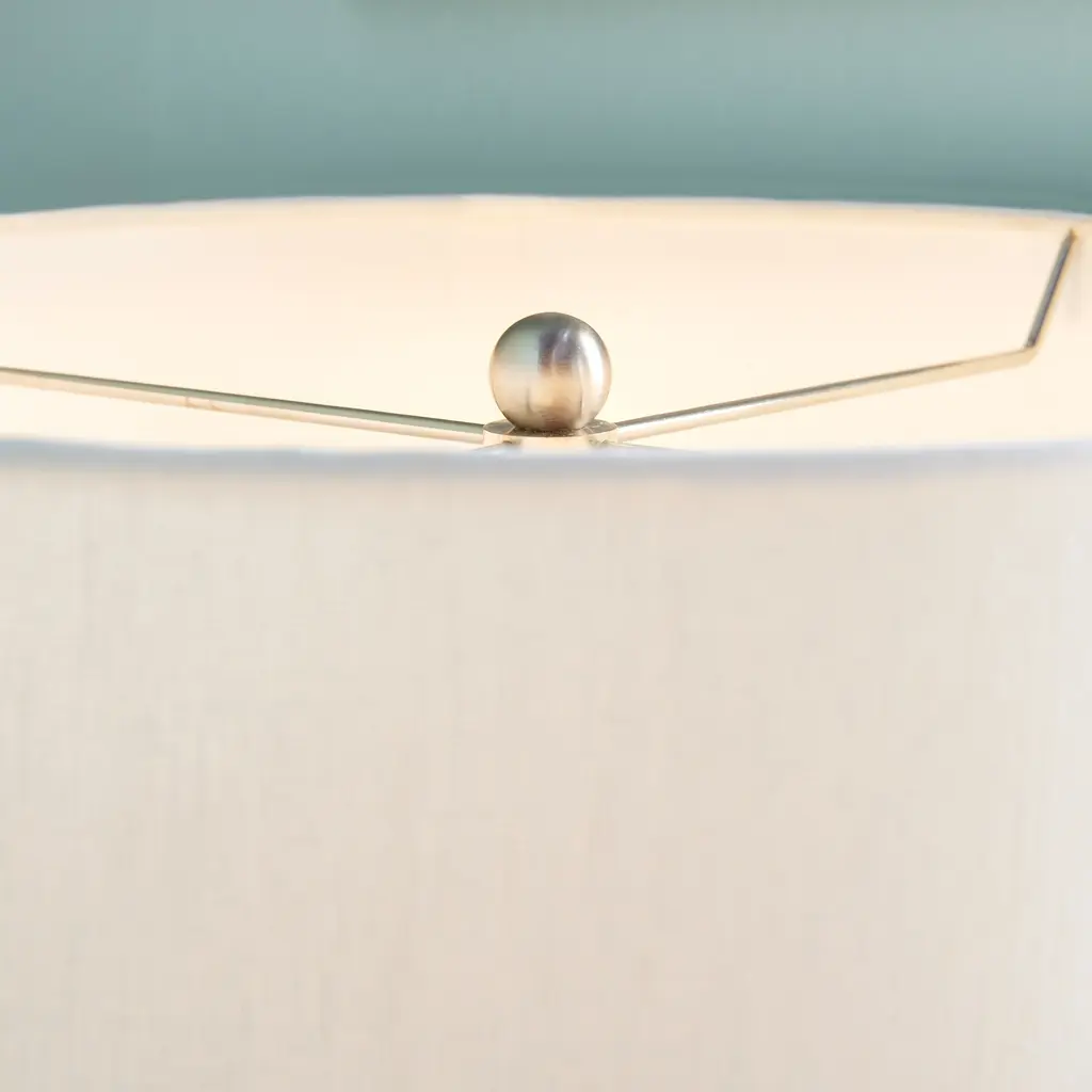 Looking for some whimsy in your lighting? This lamp is a soft taupe glass with oversized etched polka dots. Finished off with a bright white linen shade, a truly whimsical accent for console, desk or side table. (Max wattage: 60W; Bulb Base: E26 and Rotary Socket switch). Base 6 x 6 x 13.5 in., assembly instructions included.