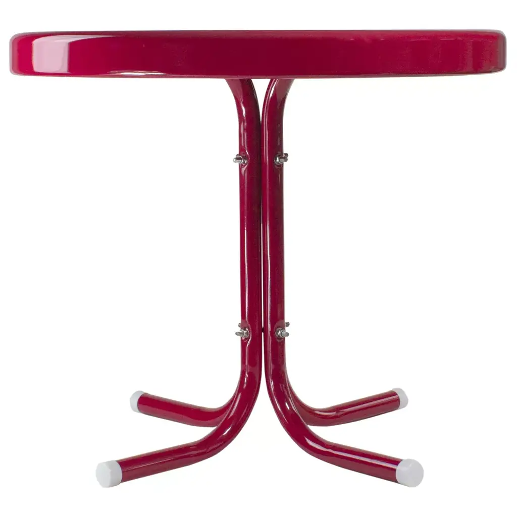 Pairs beautifully with our matching vintage style metal tulip chairs and gliders, and is the ideal size for complimenting your outdoor patio. The long-lasting enamel paint and finish allow for many years of great usage, without the worry of the table rusting or peeling. Adds the perfect pop of your color to your yard. Product Features: Outdoor retro metal tulip side table Color: pink Long-lasting enamel paint Powder-coated finish Plastic caps on legs to protect your surfaces 5-piece easy assembly For indoor or outdoor use Dimensions: 19" high x 22" diameter Material(s): steel