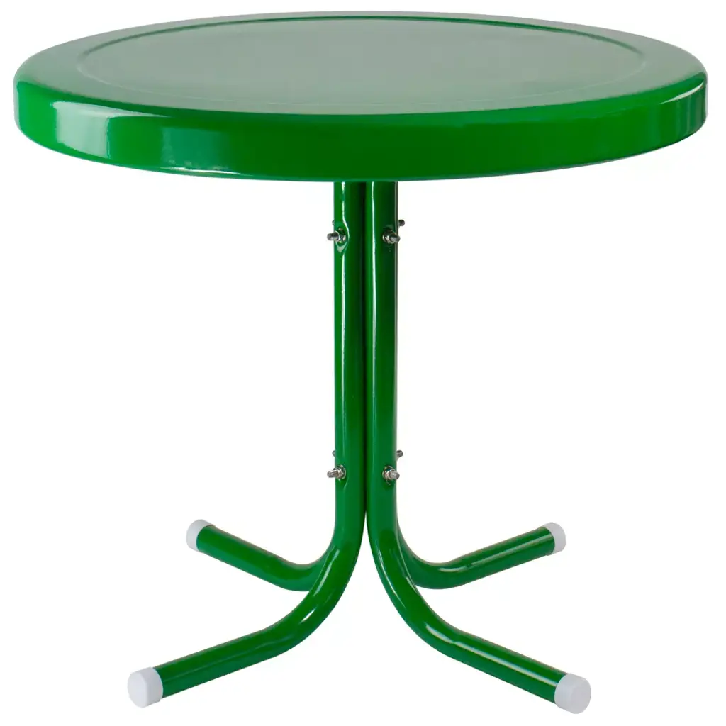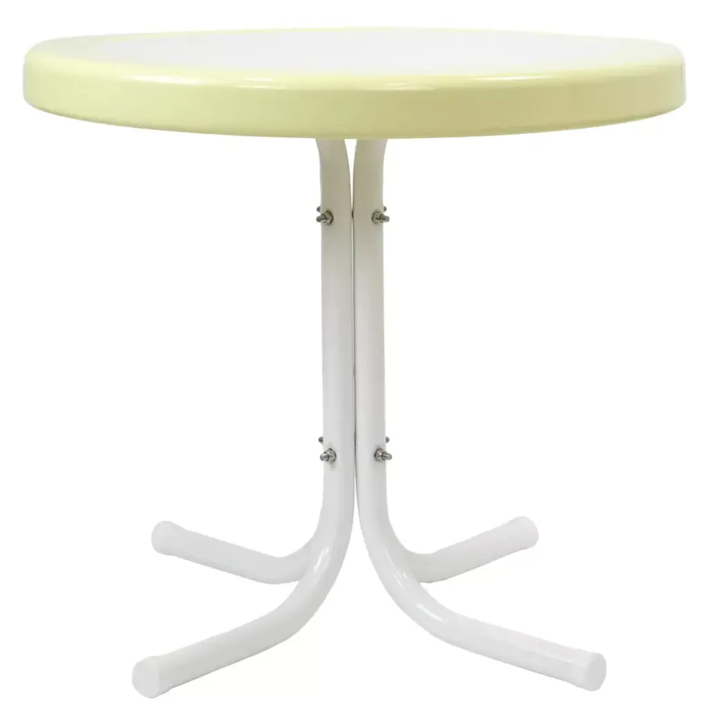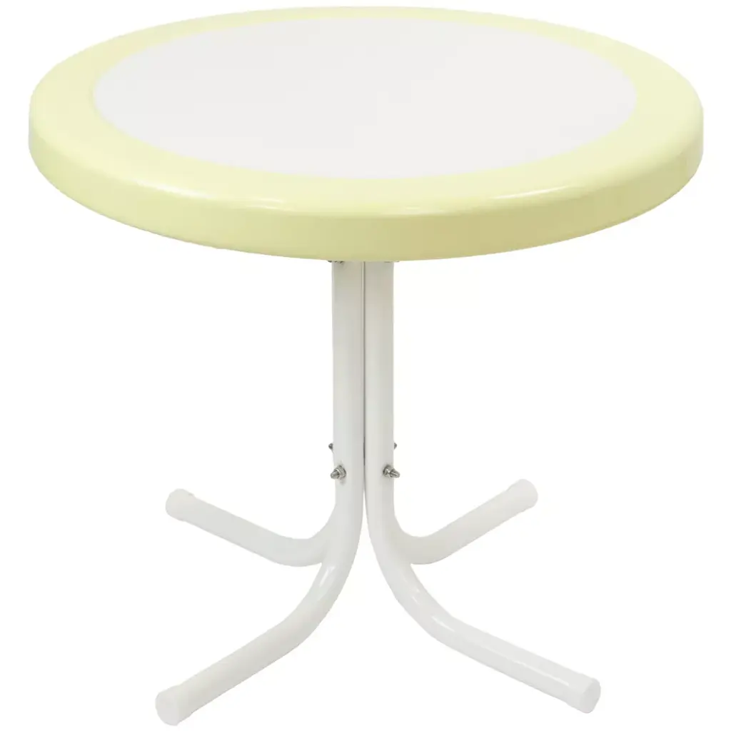 Pairs beautifully with our matching vintage style metal tulip chairs and gliders, and is the ideal size for complimenting your outdoor patio. The long-lasting enamel paint and finish allow for many years of great usage, without the worry of the table rusting or peeling. Adds the perfect pop of your color to your yard. Product Features: Outdoor retro metal tulip side table Color(s): yellow and white Long-lasting enamel paint Powder-coated finish Plastic caps on legs to protect your surfaces 5-piece easy assembly For indoor or outdoor use Dimensions: 19" high x 22" diameter Material(s): steel