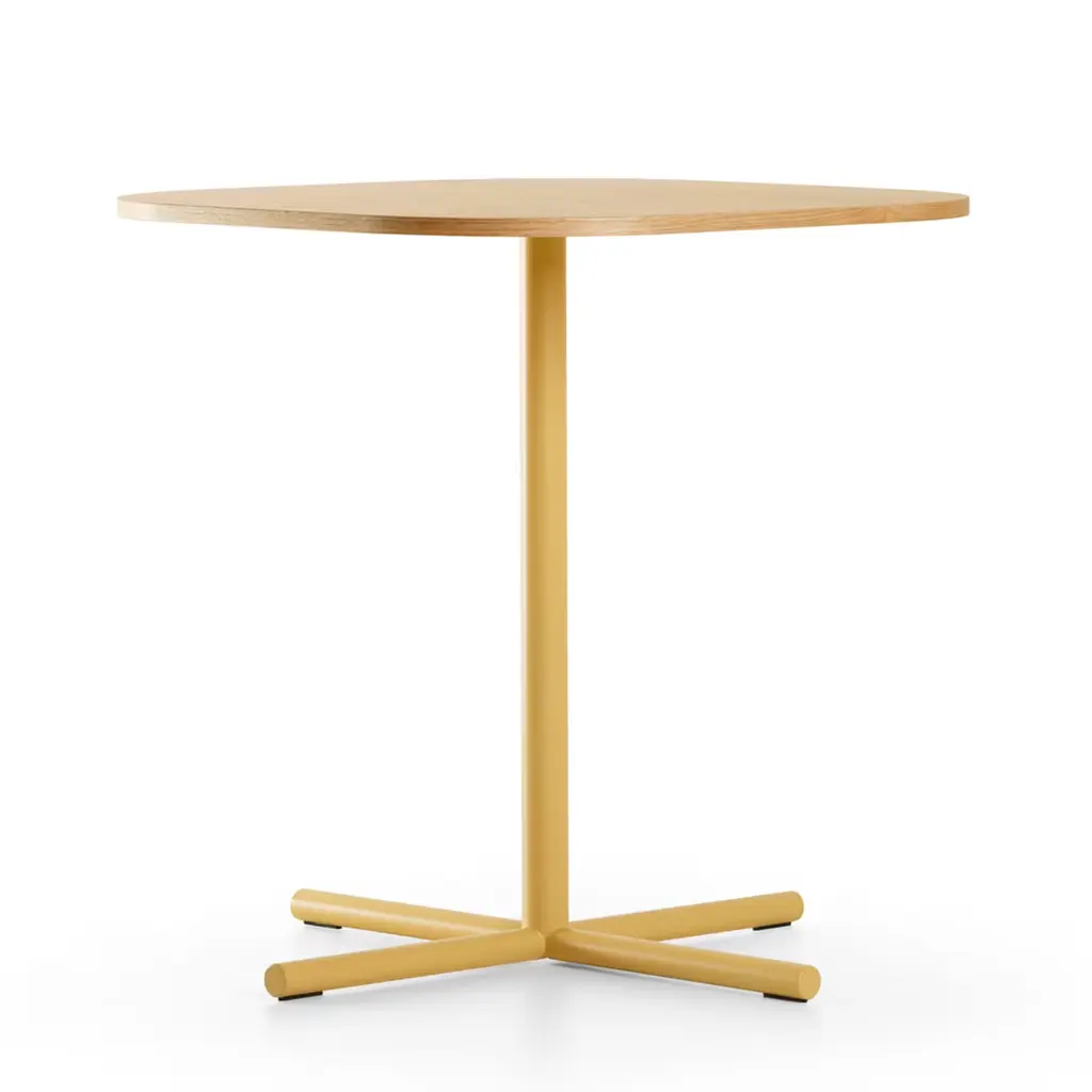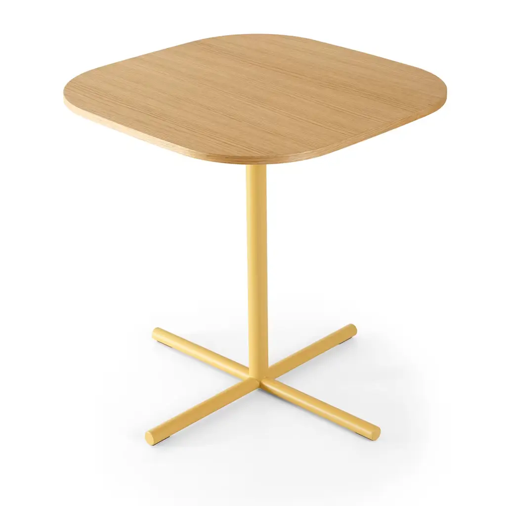Geometric volumes and soft curves define the essential silhouette of this accent table, exclusive design to complement fresh professional contexts or modern homes with equal ease. Completed by polypropylene feet for optimal grip on the floor, four cylindrical elements branch out from the central leg in pastel-yellow-lacquered steel. The top is crafted of a light wood essence and marked by rounded corners.