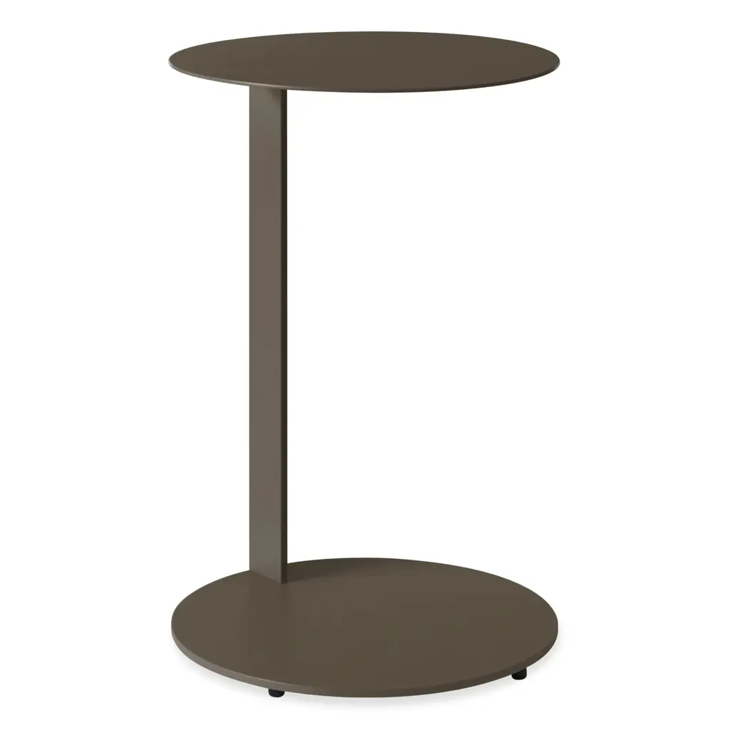 The Note Tall Side Table from Blu Dot uses a single powder-coated steel spine to support both its cantilevered round top and circular base. It seems to hover beside seating areas, providing surface space without any bulk. Rubber feet protect floors from scratches while maintaining stability during use. The cantilevered design means the table can slide partially under sofas or chairs, bringing work surfaces closer to users. It is perfect for bedside use, living room laptop work, or anywhere you need a surface that doesn't consume floor space with traditional four-leg construction.