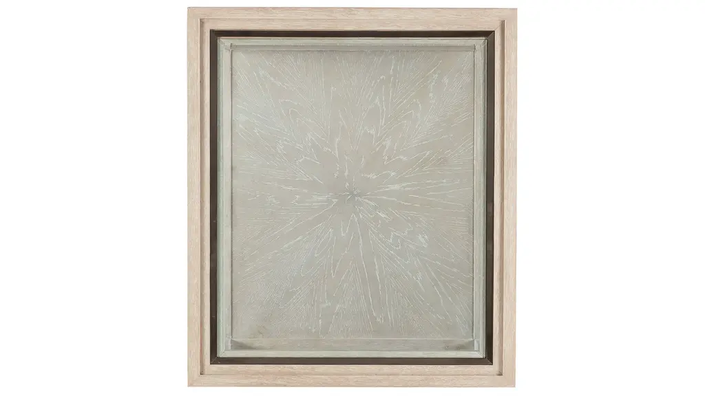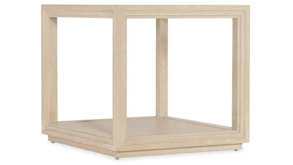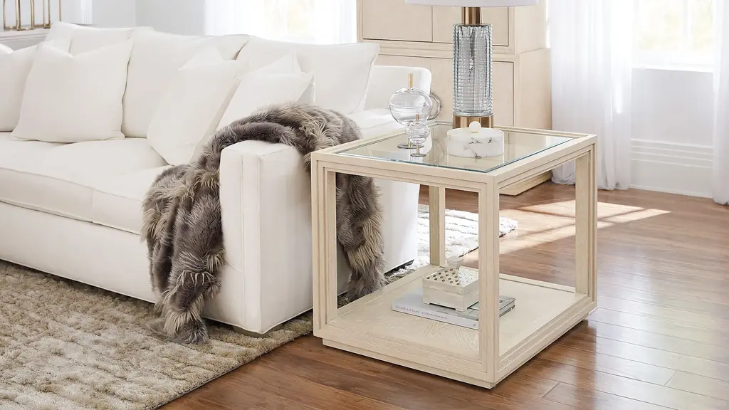 A brilliant blend of materials, the Nouveau Chic End Table combines Oak Veneers, tempered glass and a metal frame. The beveled-edge glass top looks down onto the lower wood shelf featuring a dramatic sunburst veneer pattern. Finished in the serene Sandstone finish with light wire brushing for tactile appeal.