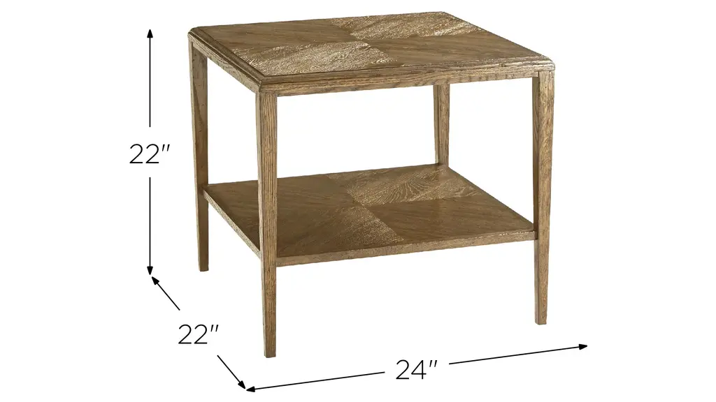 Nova's Square Side Table exhibits an original oak parquetry patterned top and bottom tier, highlighted by our Dawn finish and joined with a rustic tapered oak leg.