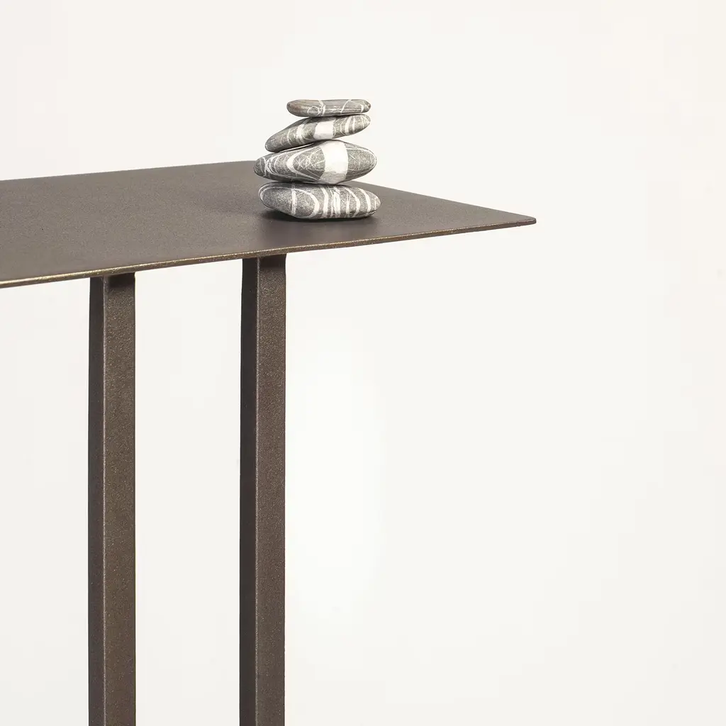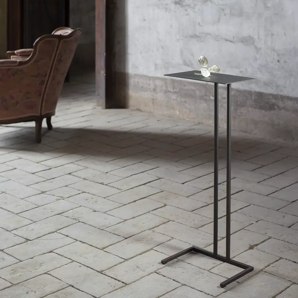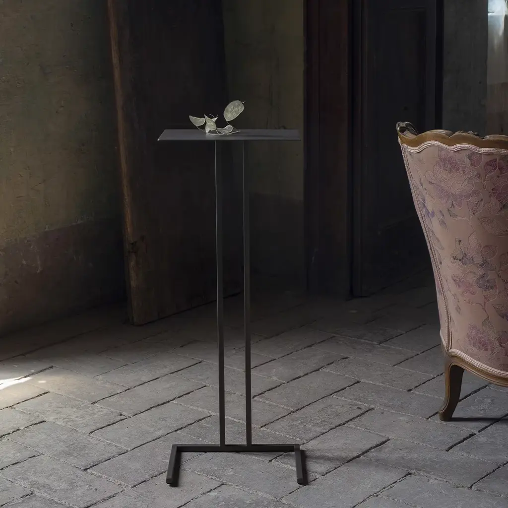 Timeless elegance and a highly functional character merge in this stupendous side table, a lightweight and elegant design named after the river that flows near the Montanaro Castle, a historical medieval building located in the Piemonte region, Italy. This iconic piece can be arranged near a sofa, with its base perfectly wedging in any structure. A refined and minimalist design, it is handmade of brown-lacquered metal.