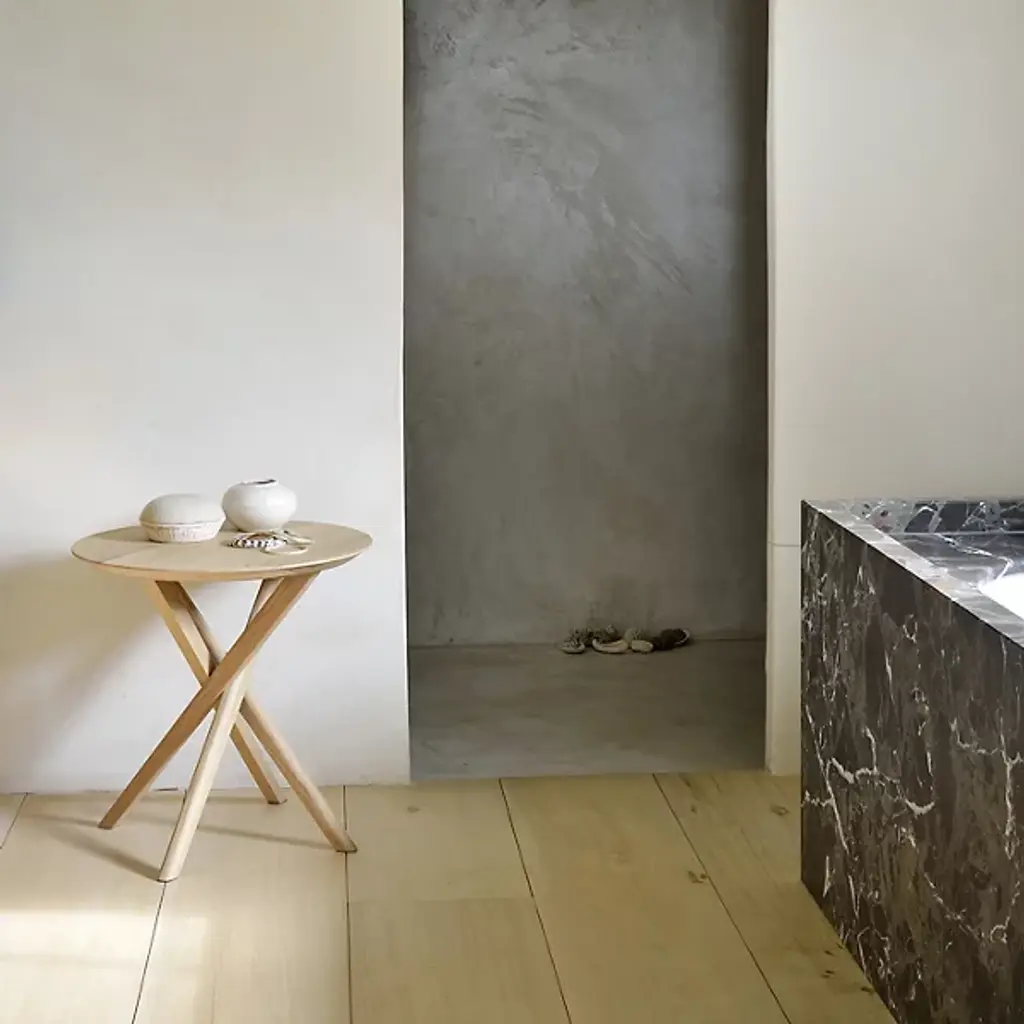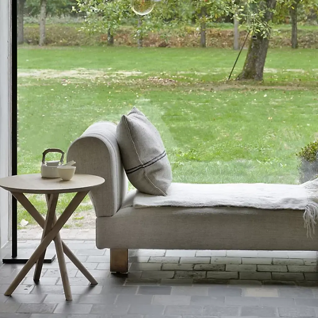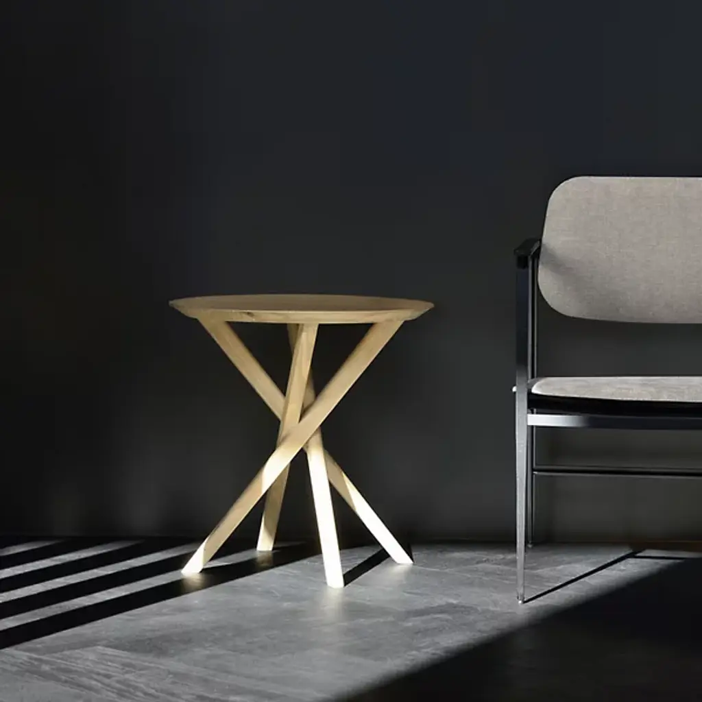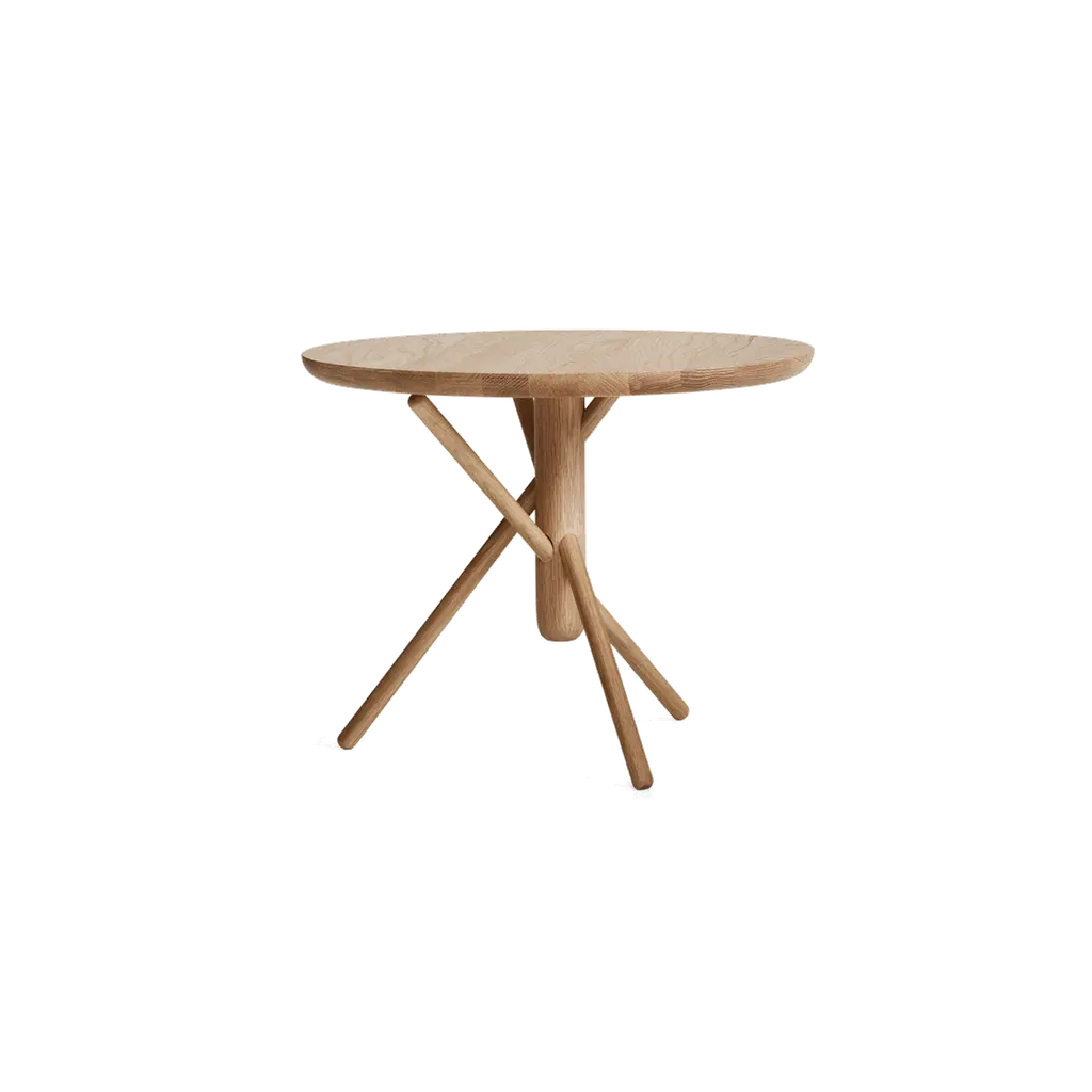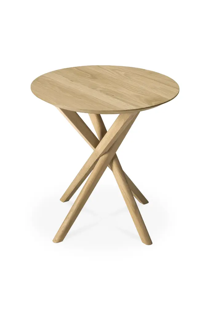 Add an intriguing silhouette to the décor of your modern home with the Oak Mikado Side Table from Ethnicraft. Simple yet appealing, this piece is made of solid and natural oak wood. The round surface provides the perfect amount of room for a cherished accent piece or snacks and drinks. A set of thick legs underneath angle sharply as they connect with the ground, creating a tight and eye-catching collection that stands out in the space.