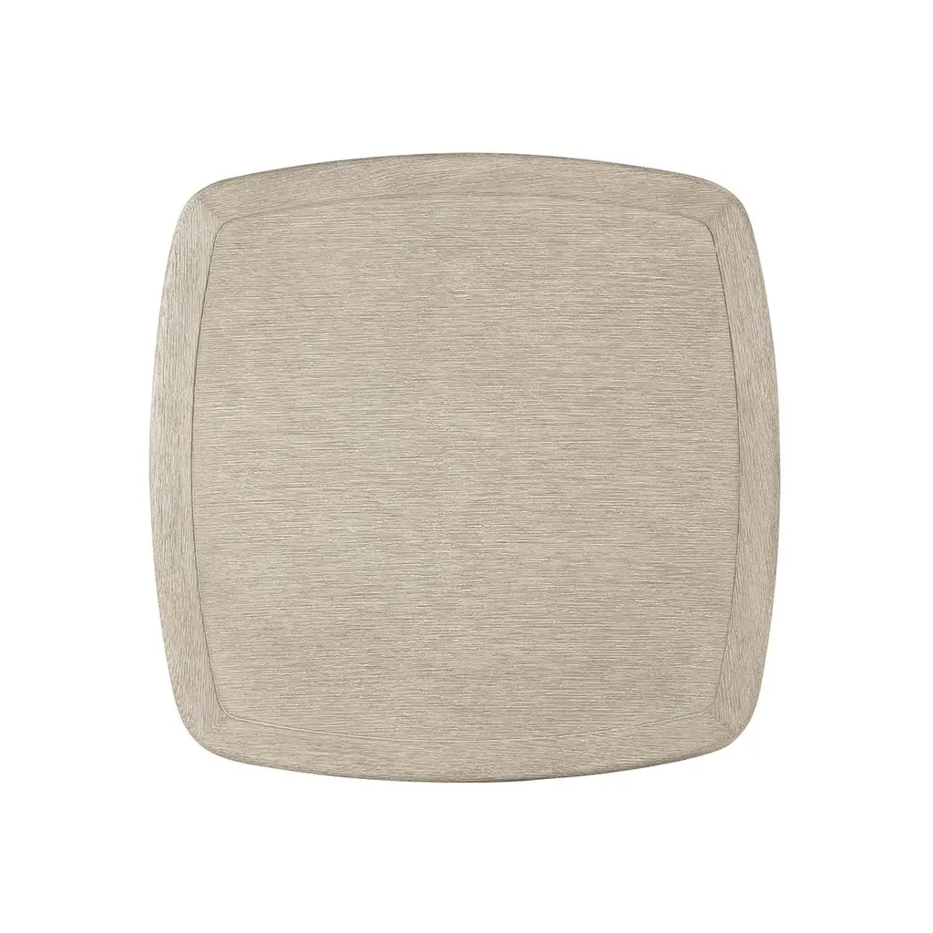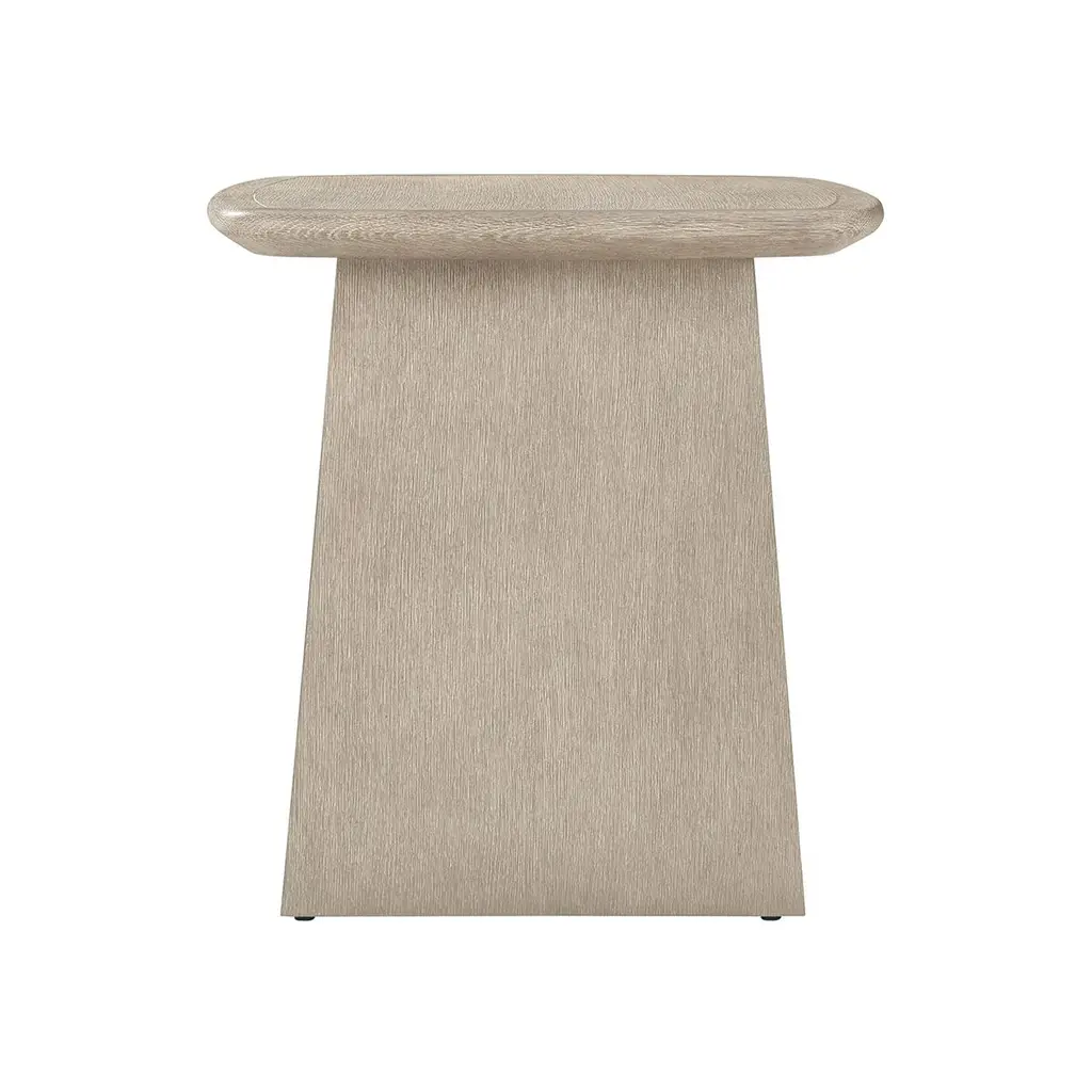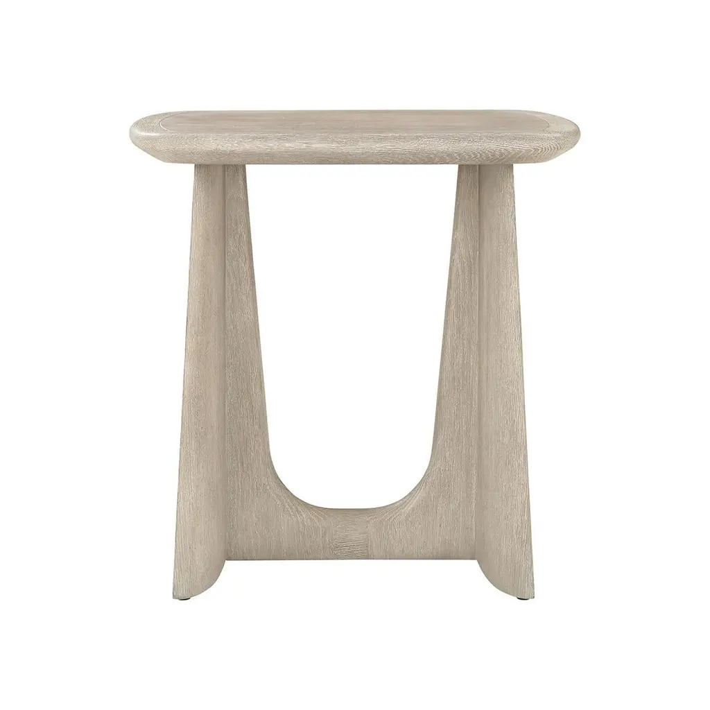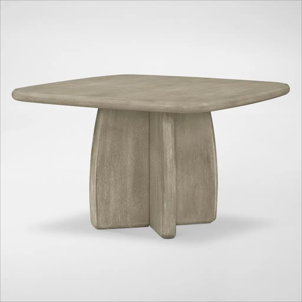 This square modern table has a tray dish top that squarely sits solidly on filled Trapezoid style legs. In a hand-rubbed greyed oak finish to bring out the wood's natural wood grain.Dimensions: 24" W x 24" D x 22" H