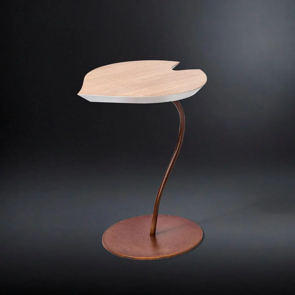 Poetically interpreting the simple elegance of nature, this side table is a delicate addition to both modern and classic interiors. Its top is shaped like a leaf and crafted of MDF with a white oak finish. The support is a curved iron rod stemming from a round iron base, both lacquered to give them an organic effect that resembles Corten. This piece is available in other finishes, please contact the Concierge for other options and details.