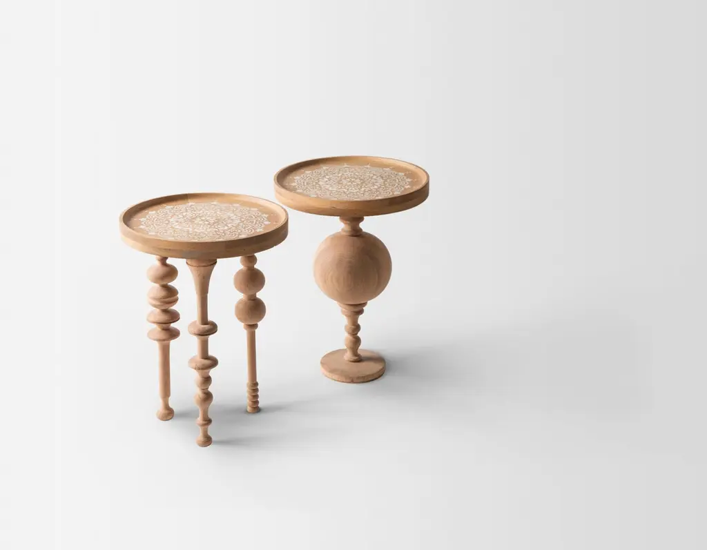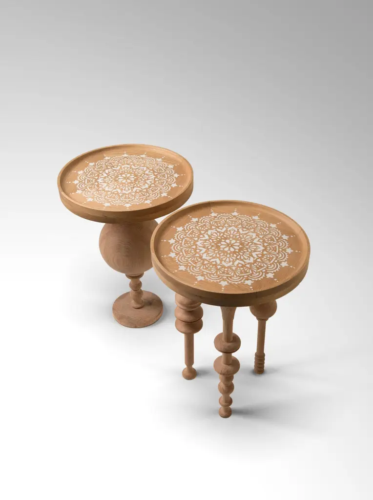 Oak Wood Side Table Set with Arabesque-Inspired Legs & Stenciled Mandala Motif .A set of classic tables with a contemporary flair, Our Funky Fusion side tables are made of Oak wood with a custom-stenciled Mandala motif. They are both relaxing and eye-catching with a raw and original feel. The arabesque-inspired legs nod to traditional Islamic craftsmanship; they are beautifully grooved to reflect our heritage infused with a modern twist. Available in a larger size as a coffee table.