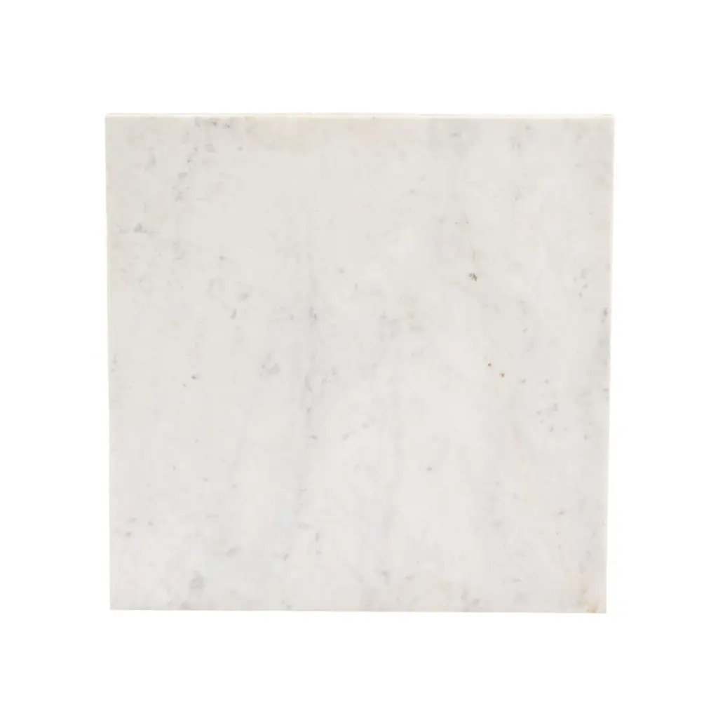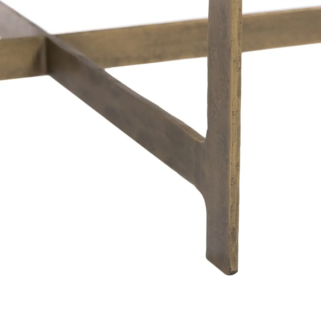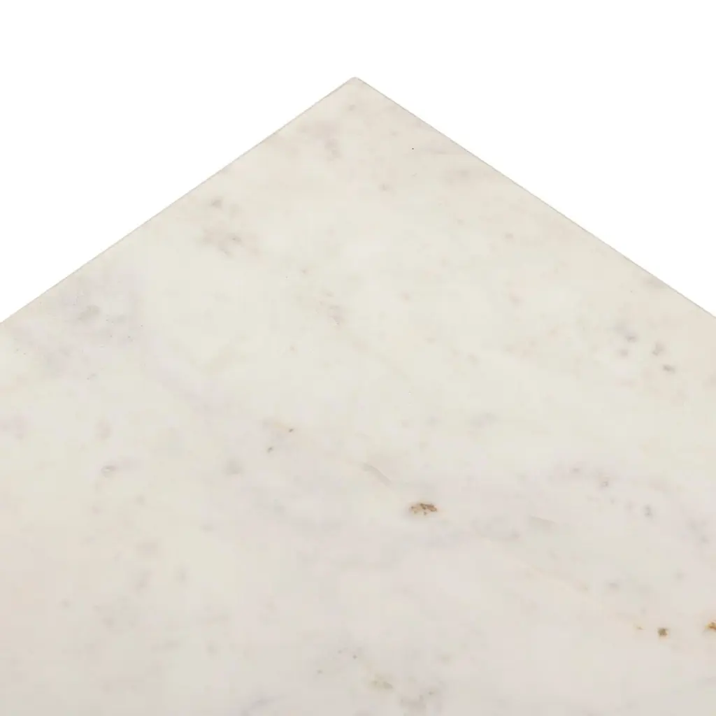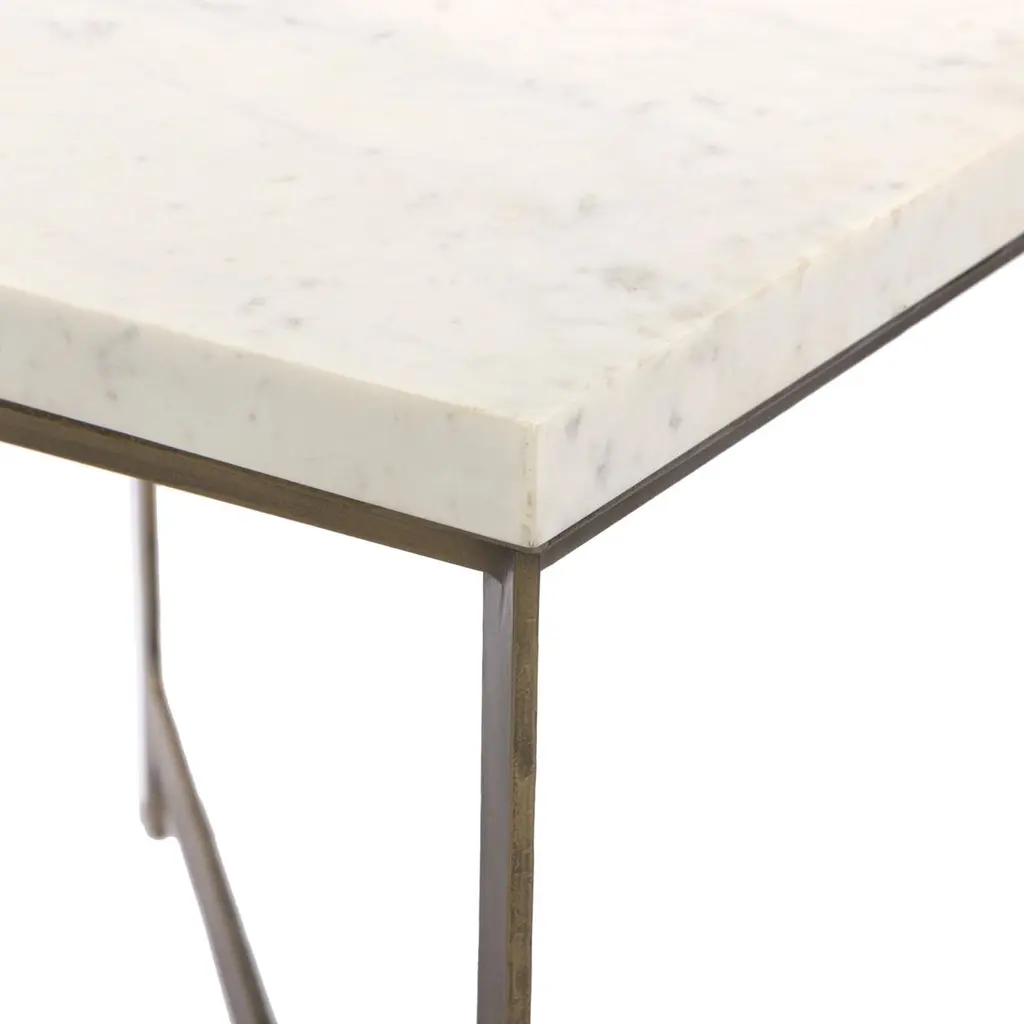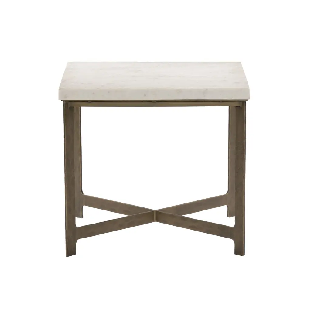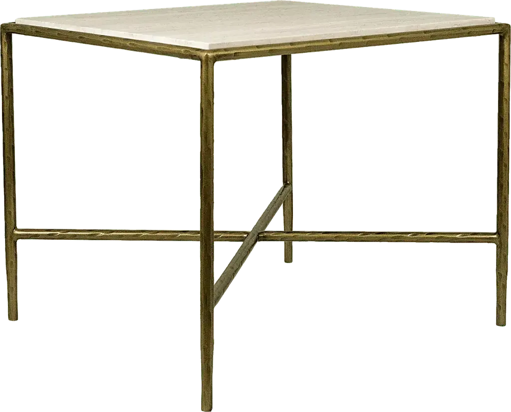 An open, hand-hammered base supports a squared top of marble, creating a beautifully streamlined look with rustic vibes. This end table combines elegance with a touch of artisanal craftsmanship, making it a versatile addition to any living space.