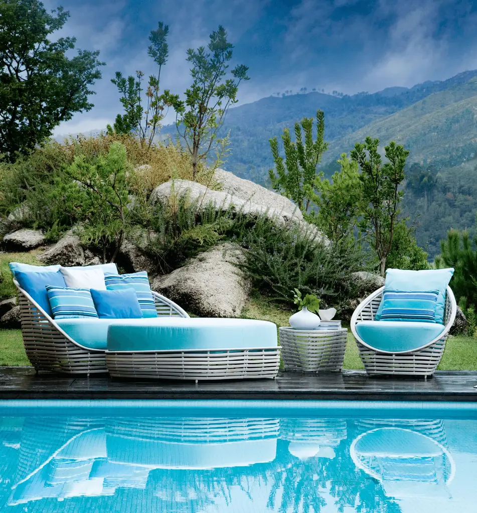 Inspired by the delicate shape of the tulip, Oasis provides a soothing comfort. This collection made of polyethylene and aluminum invites you to sink into its concave form and plump cushion.